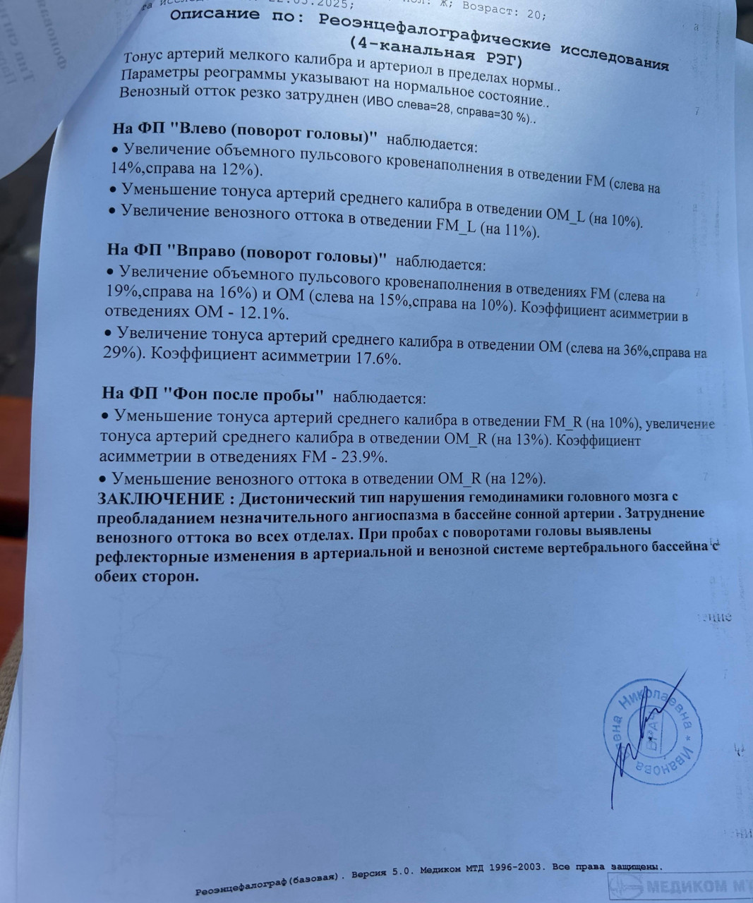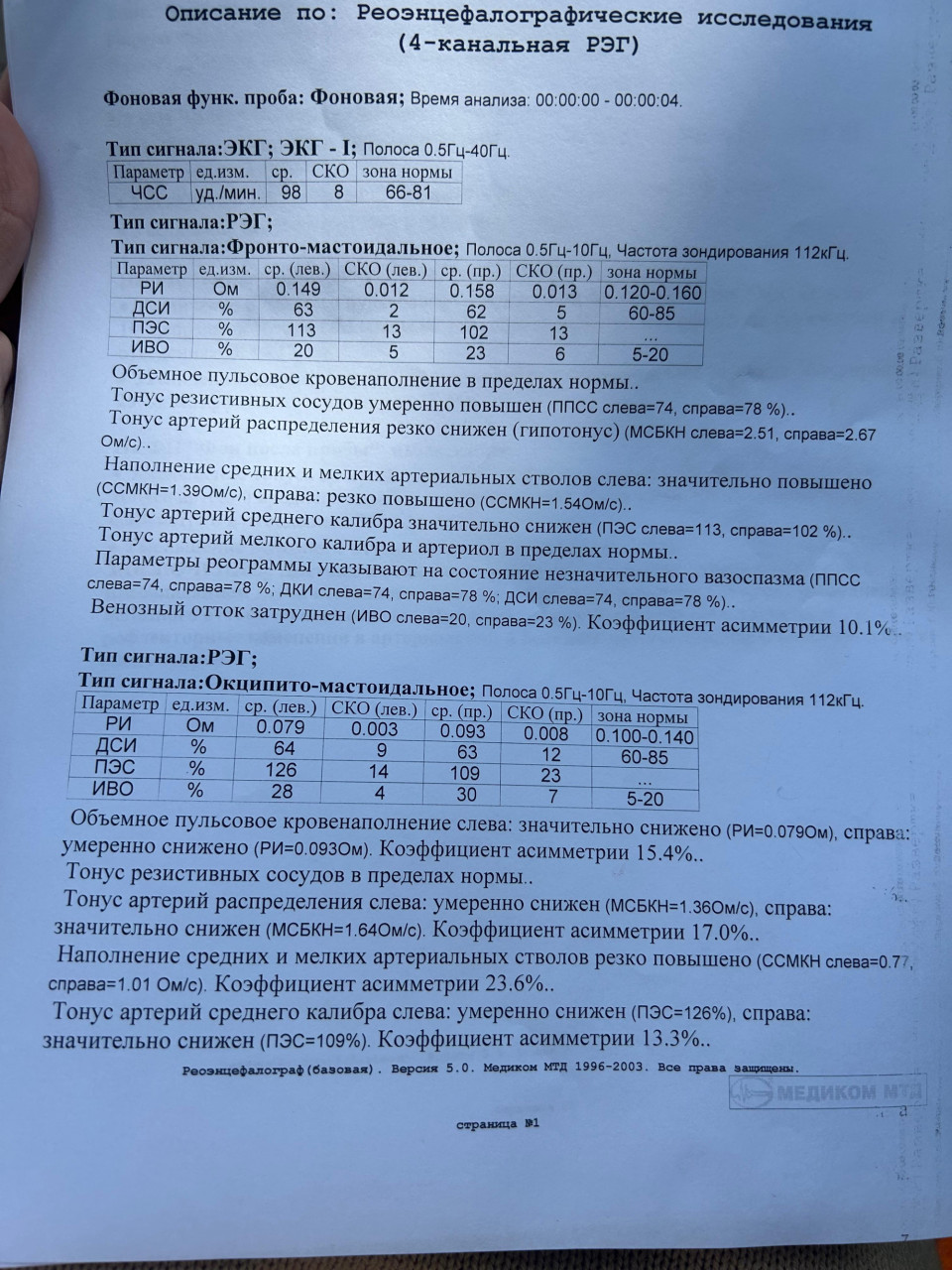 Здравствуйте. По описанию и результатам РЭГ вероятна мигрень или церебральная ангиодистония с нарушением венозного оттока. Также могут быть проявления вертебро-базилярной недостаточности на фоне шейного остеохондроза. Но точный диагноз ставится только очно после неврологического осмотра и при необходимости МРТ головного мозга и шейного отдела. Лечение подбирается индивидуально, витамины и массаж в вашем случае недостаточны.
