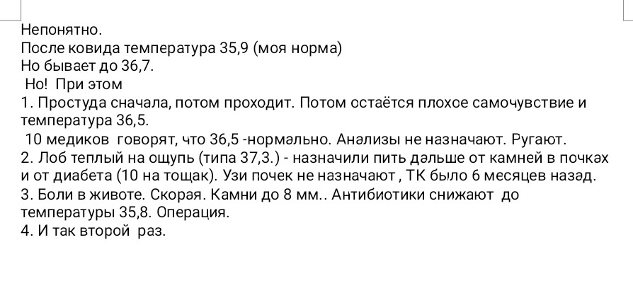 Здравствуйте. Температура тела у человека действительно может естественно колебаться в течение дня от 35 до 37 °C это вариант нормы. Однако если вы ощущаете ухудшение самочувствия при температуре 36,5 °C, особенно после перенесённого COVID-19 и с фоновыми заболеваниями (камни в почках, диабет), это может быть связано с воспалительными процессами или индивидуальной реакцией на инфекции и медикаменты. Ваши жалобы обоснованы и при повторяющихся эпизодах с болями и операциями целесообразно настаивать на дообследовании (УЗИ, общий и биохимический анализ крови, С-реактивный белок).