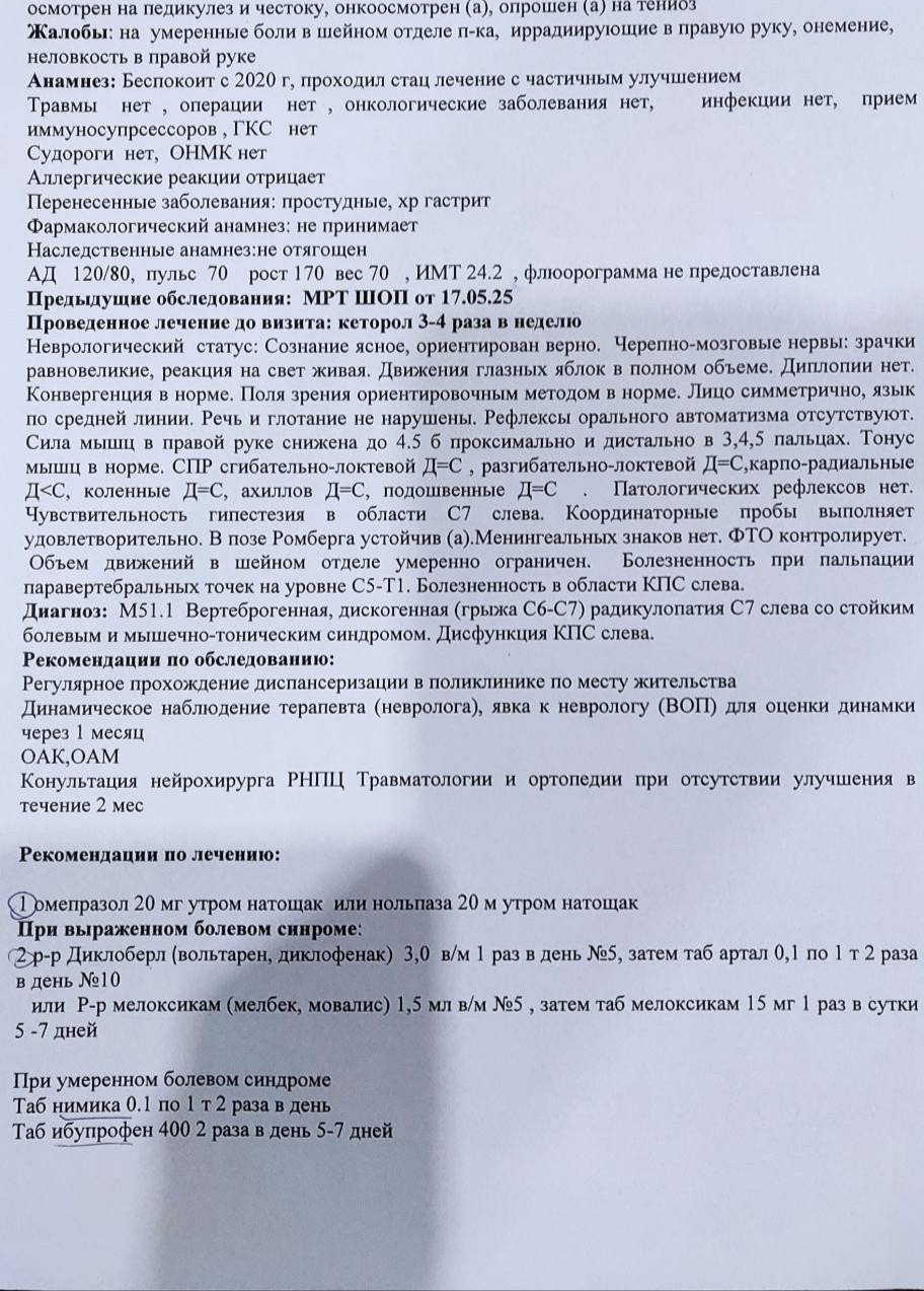 Здравствуйте. Диагноз MS1.1 (радикулопатия C7) по МКБ-10 соответствует M50.1 это поражение межпозвоночного диска шейного отдела с радикулопатией, так что да ваш врач указал код верно. Клинические данные (гипестезия, слабость в пальцах, боль в зоне C7) подтверждают этот диагноз.