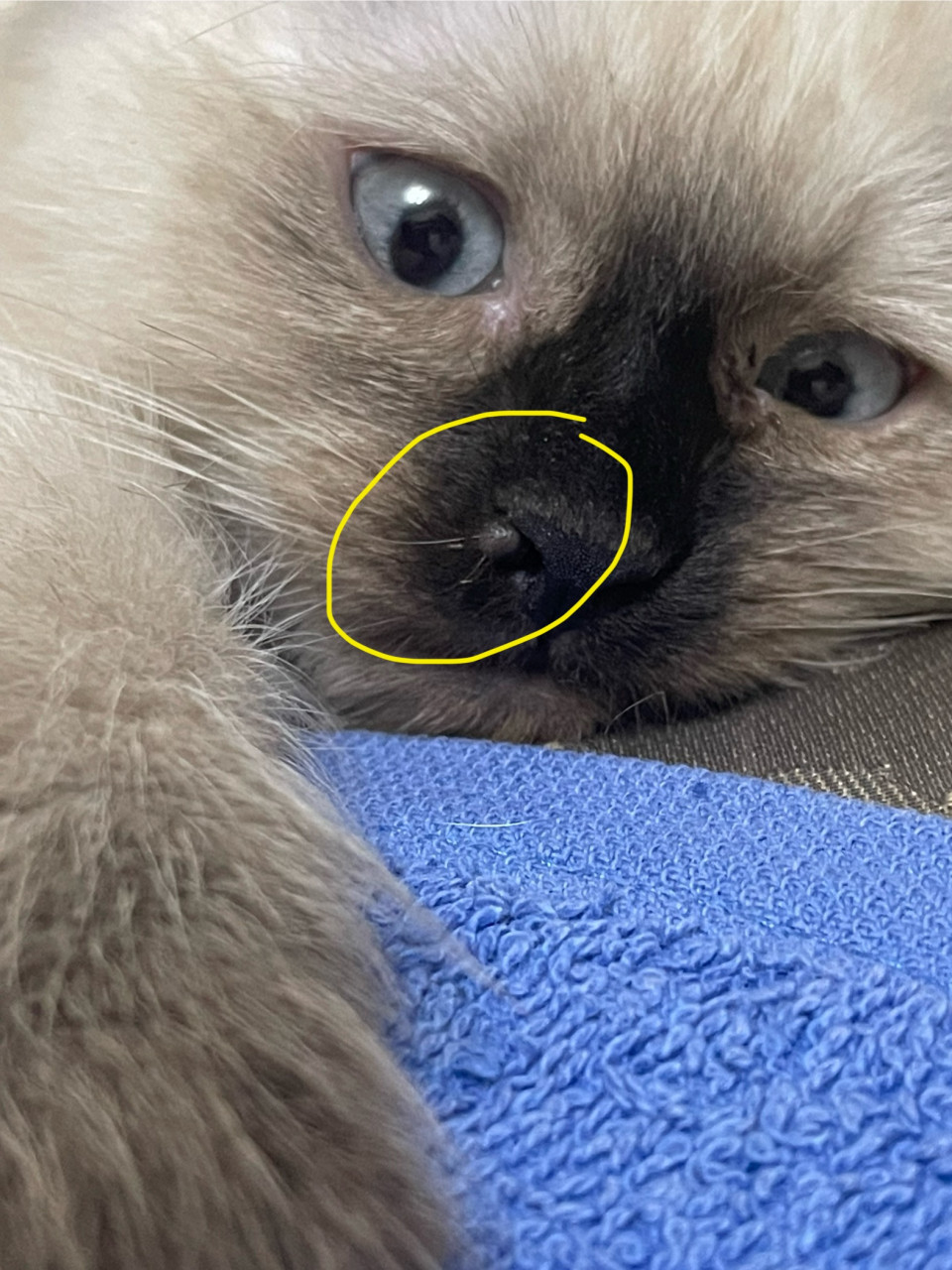 Здравствуйте. На фото видно тёмное пятнышко в области носа, которое может быть пигментным пятном (родинка) у некоторых котят это бывает нормой. Если образование не увеличивается, не кровит и котёнок чувствует себя хорошо то скорее всего оно неопасно, но желательно показать ветеринару при плановом осмотре так как по фото нельзя с точностью определить, что это.