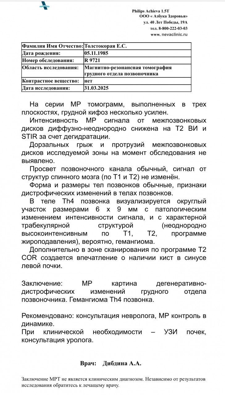Здравствуйте. Ваши жалобы типичны для хронического дорсалгического синдрома, вызванного дегенеративными изменениями позвоночника. На фоне отсутствия грыж и сужения канала главное поддерживающая терапия этоЛФК, плавание, реже массаж. Хорошо работают мануальная терапия (мягкие техники), иглорефлексотерапия. При обострениях НПВС, витамины группы B, при выраженном головокружении возможно назначение бетагистина. Гемангиома в Th4 это доброкачественное образование, лечению не подлежит, но требует МРТ-контроля 1 раз в год.