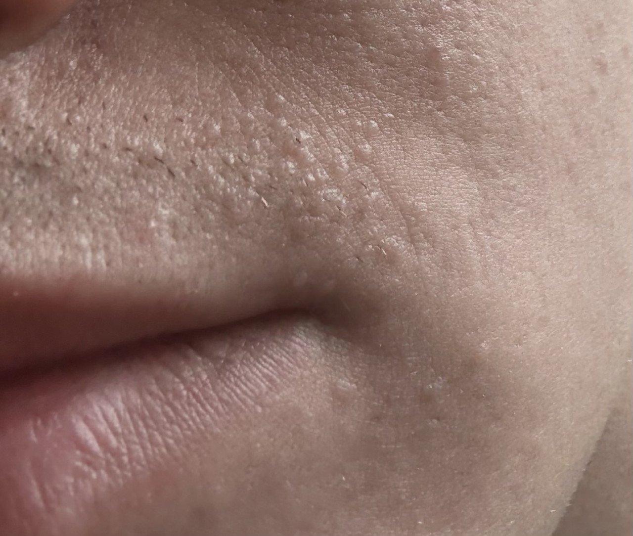 Здравствуйте. По фото высыпания выглядят как мелкие, поверхностные, плотные папулы, без признаков воспаления или изъязвлений. Это не похоже на типичный герпес, который проявляется в виде болезненных пузырьков, склонных к мокнутию и корочкам. Возможные причины это миллиумы (просянка), гиперкератоз, либо фолликулярные пробки.