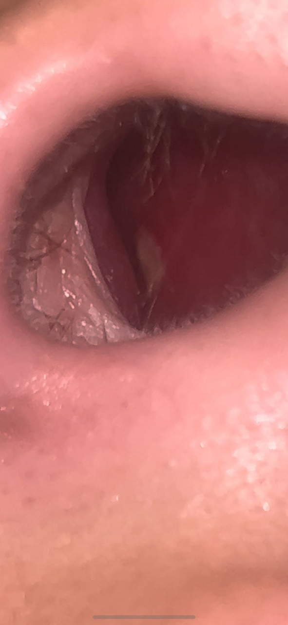 Здравствуйте, помогите пожалуйста, у нас в больнице нет лор врача, а терапевт наш только и любит назначить антибиотики не взяв анализы. Сильно болело в носу утром 6 июня , я подумала ринит как зимой был и сильно внимания не обращала, легла спать, просыпаюсь поднялась температура 37.3 держалась так весь день в носу так и болело в левой ноздре, заболела шея, больно было повернуть с правой стороны, подумала заболела так как ломило сильно все тело и была сильная слабость, на следующий день тело ломить перестало, температура прошла, шея чуть болит и в носу так и осталось очень больно, только болело в левой ноздре, а теперь и в правой, сегодня фонариком подсветила, а там такой ужас везде будто кожи нету, корка огромная на весь нос, язвы болит ужасно вчера заметила что-то типа очень маленьких белых пузырьков на 2 фото это может быть герпес или что-то другое раны в носу белого цветы ? Герпеса на губах никогда не было, недавно переболела генитальным герпесом 1 типа, может это он? Помогите пожалуйста, что делать?