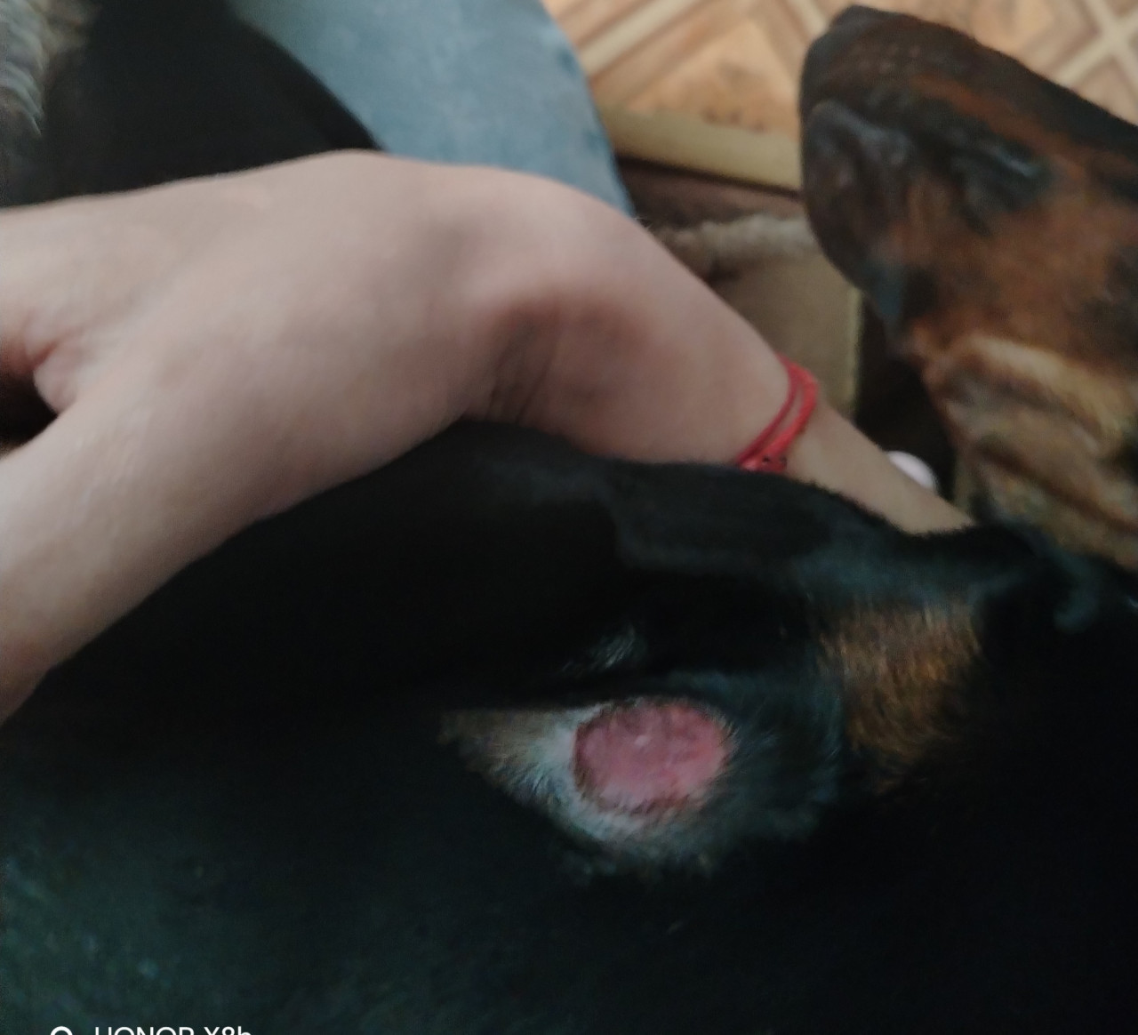 Здравствуйте. По фото видно оголённый участок кожи с покраснением, что может быть как мозоль от трения шлейки, так и дерматит или грибковое поражение. Если участок не заживает, увеличивается или появляется зуд тогда лучше показать ветеринару для точного диагноза и лечения.