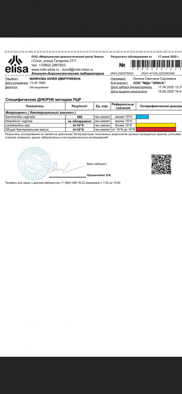 Здравствуйте. Анализ показывает преобладание нормальных лактобактерий и небольшое количество Gardnerella vaginalis в таком количестве она может быть вариантом нормы. Если нет зуда, запаха и других симптомов то лечение скорее всего не требуется, но при появившихся жалобах желательно пересдать анализ или пройти осмотр у гинеколога.