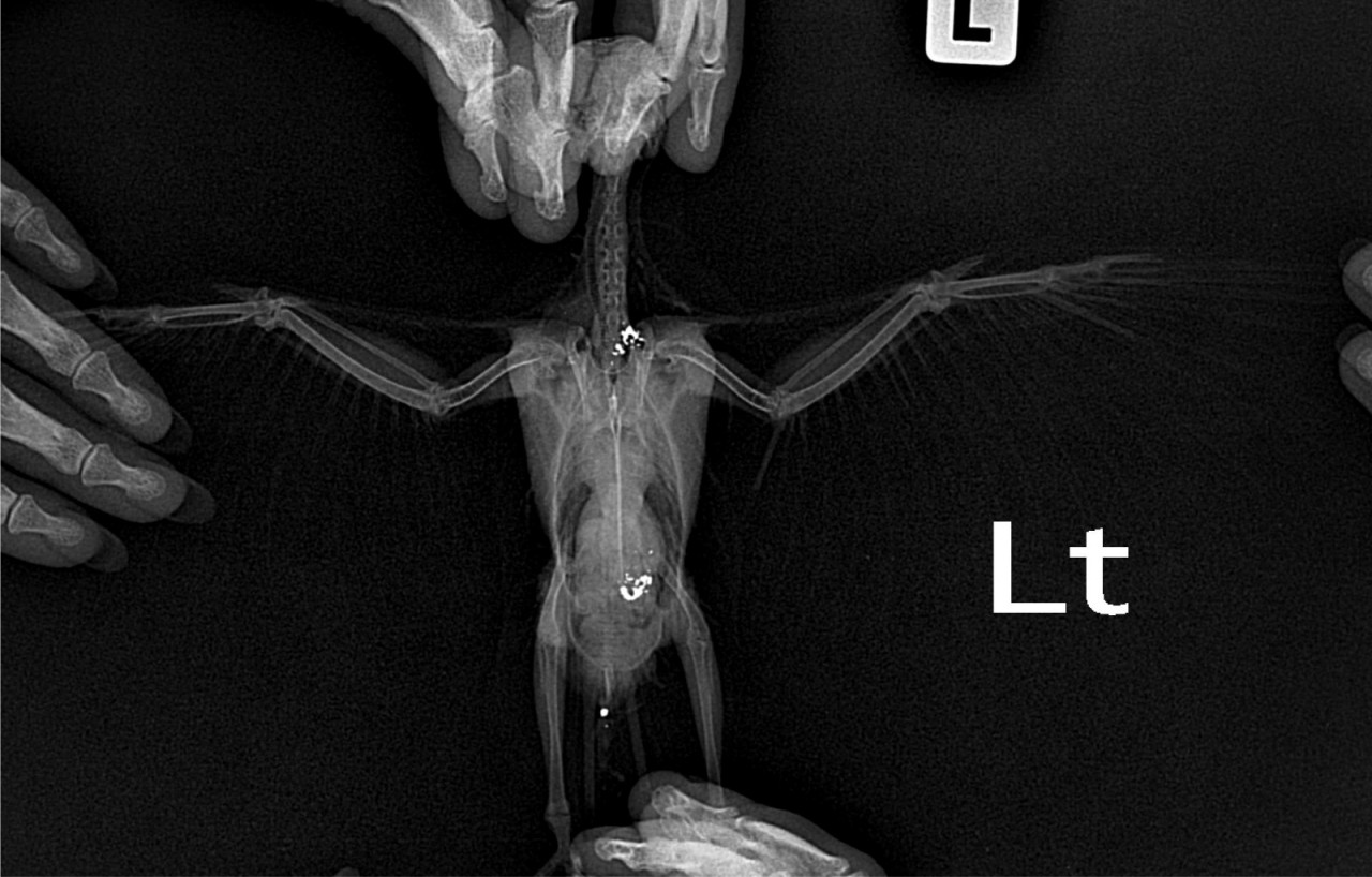 Здравствуйте. На рентгене действительно видны яркие рентгенплотные включения в проекции зоба или желудка, что нехарактерно для обычного корма и скорее всего указывает на инородные тела с содержанием металла, возможно свинец или цинк.