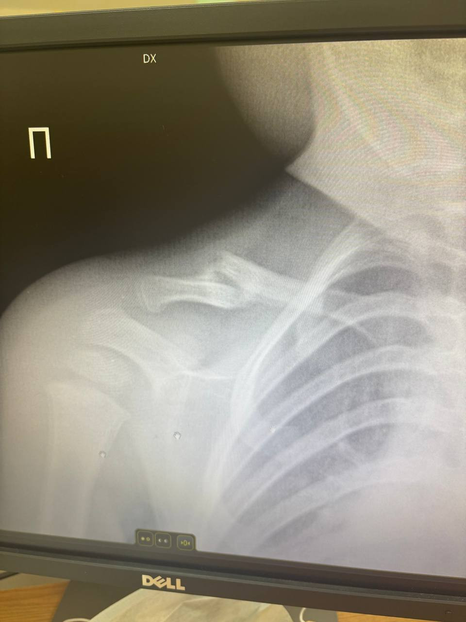 Здравствуйте. По снимку действительно видно перелом ключицы, но для ребёнка в возрасте 1 года 3 месяцев это довольно частая травма и процесс сращения может быть не сразу заметен на рентгене, особенно если перелом без смещения. У малышей кость быстро регенерирует и зачастую образуется костная мозоль позже визуально чем у взрослых. Главное это отсутствие боли, отёка и подвижности в месте перелома. Повязку продолжают носить до 4 недель, затем контроль.