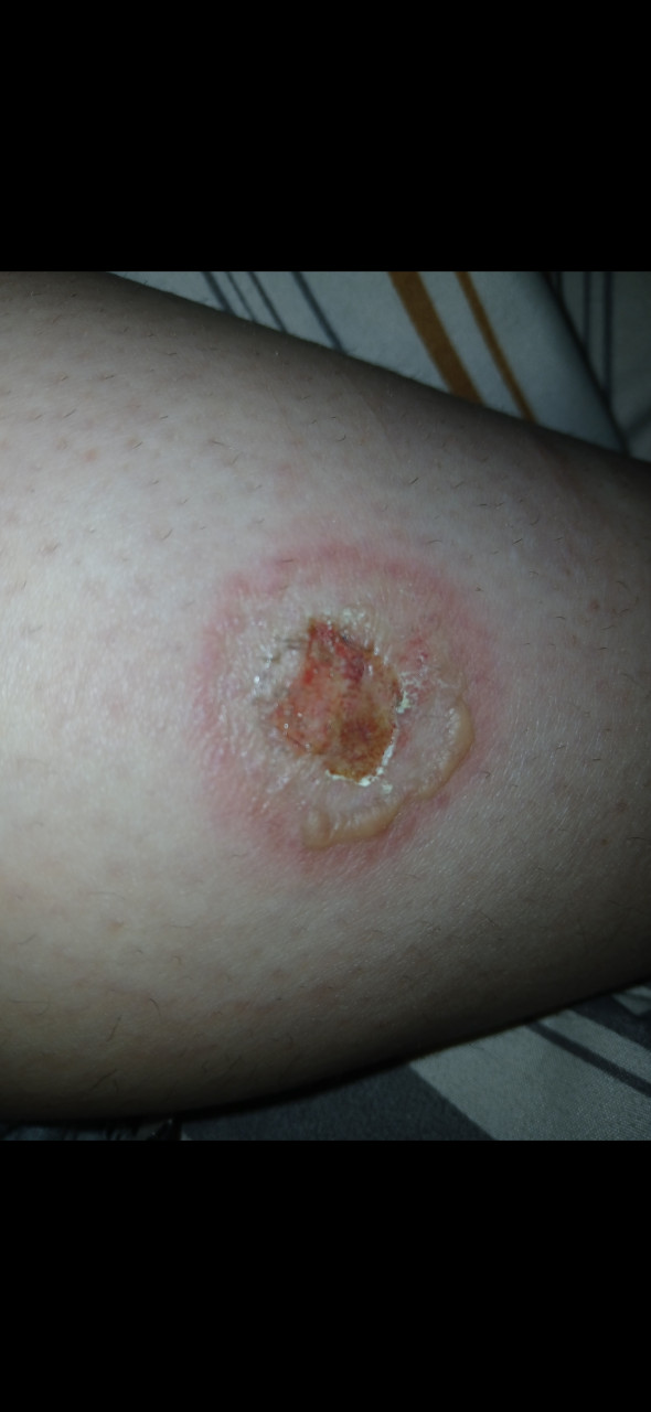 Здравствуйте. По фото видно, что пузырь вскрылся или подсыхает и на его месте участок с розовой грануляционной тканью и коркой. Это говорит о восстановлении кожи после поверхностного ожога II степени, что в целом является нормальным этапом заживления.