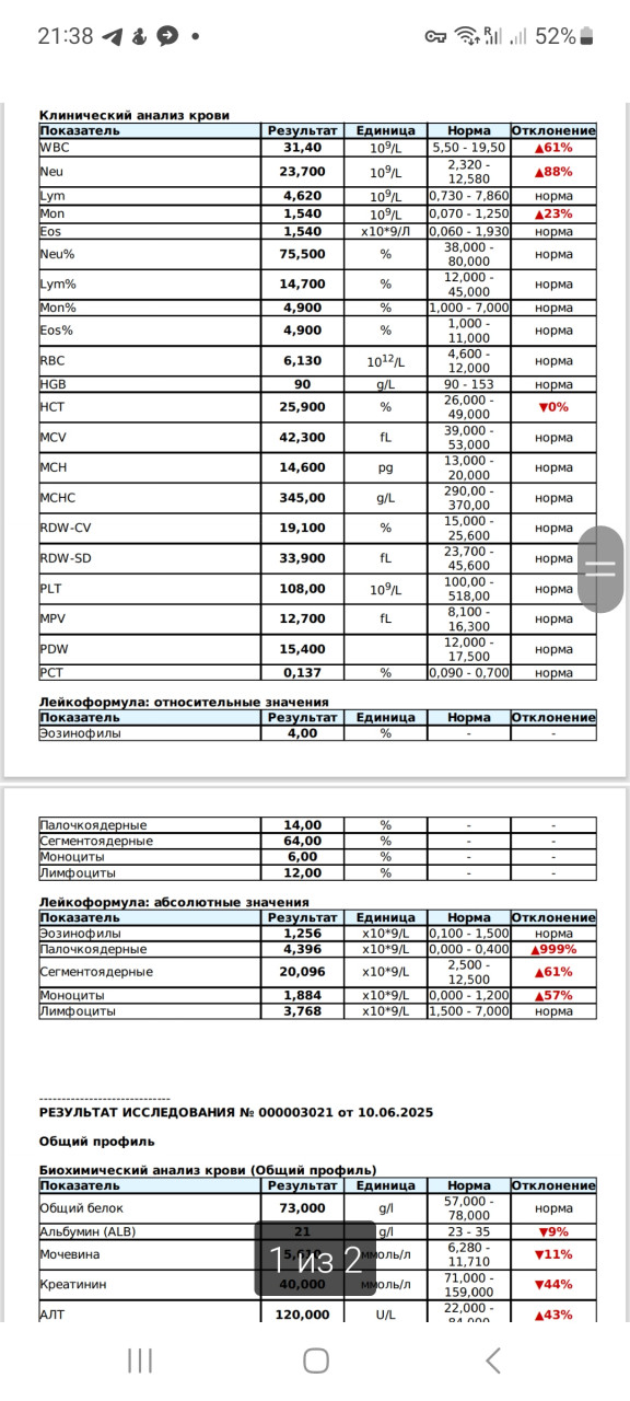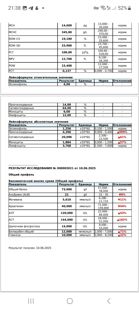 Здравствуйте. Такая клиника может быть как следствием травмы (удар по голове), так и нейроинфекционного заболевания например токсоплазмоза, вирусного энцефалита или отита с переходом на мозговые оболочки. Анализы показывают сильный воспалительный процесс и анемию, что нехарактерно только для травмы. Рекомендую продолжить обследование (серология на инфекции, УЗИ, нейровизуализация) и как можно скорее начать поддерживающее и противовоспалительное лечение.