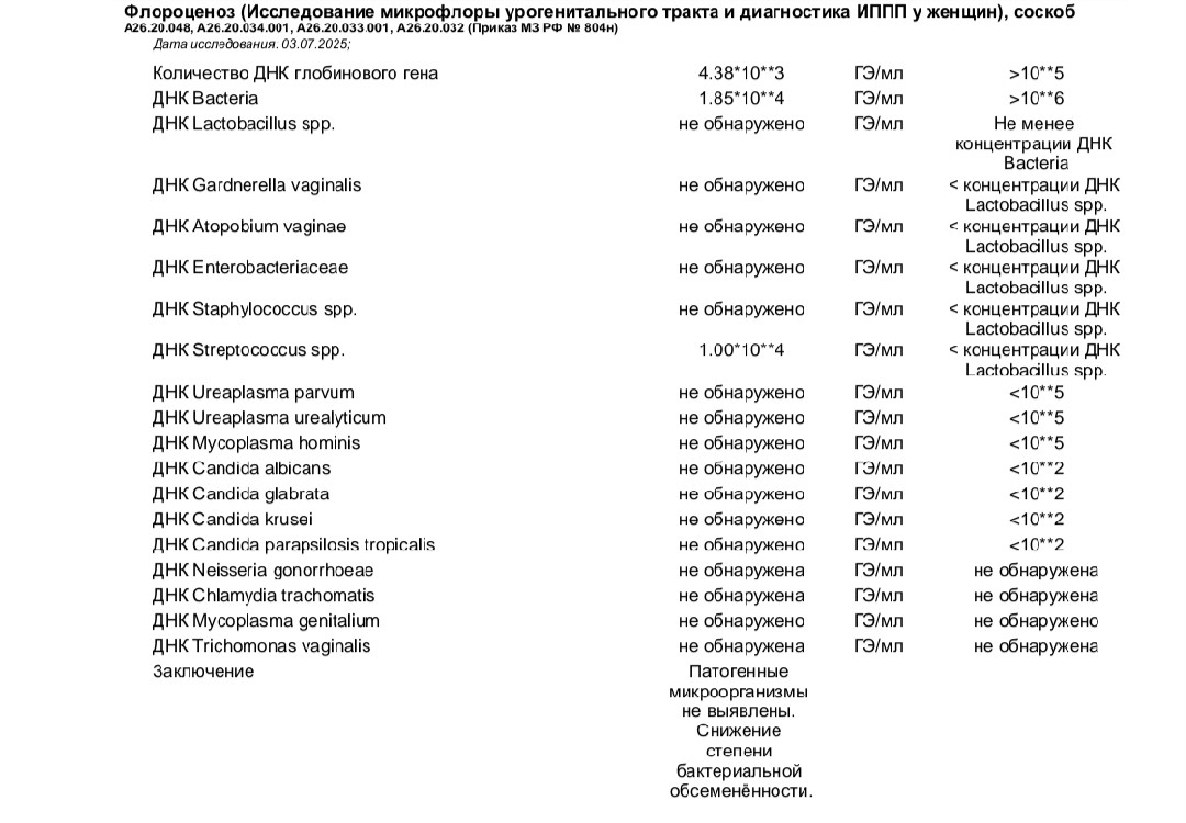 Здравствуйте. В вашем анализе действительно выявлено выраженное снижение уровня нормальной микрофлоры (лактобактерий), что называется дисбиоз влагалища. При этом патогенные бактерии (условно-патогенные например гарднереллы, кандида, микоплазмы) не обнаружены это хороший знак. Отсутствие лактобацилл и преобладание стрептококков может вызывать зуд, ощущение сухости, повышенную чувствительность и болезненные менструации, поскольку нарушается кислотно-щелочной баланс и защитная функция слизистой.