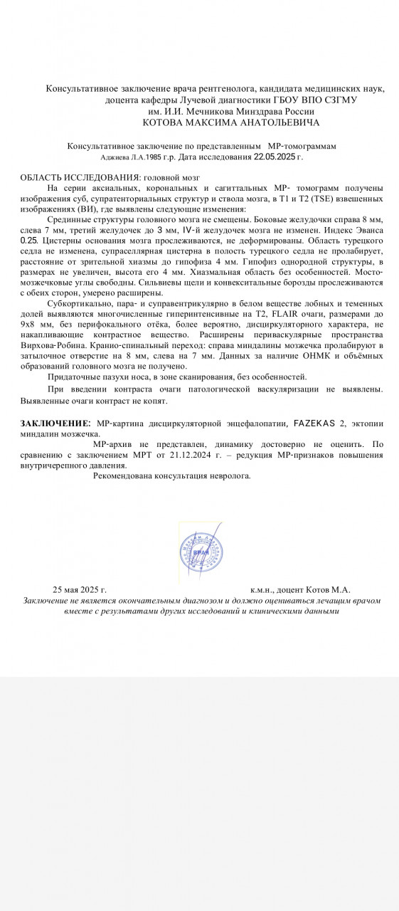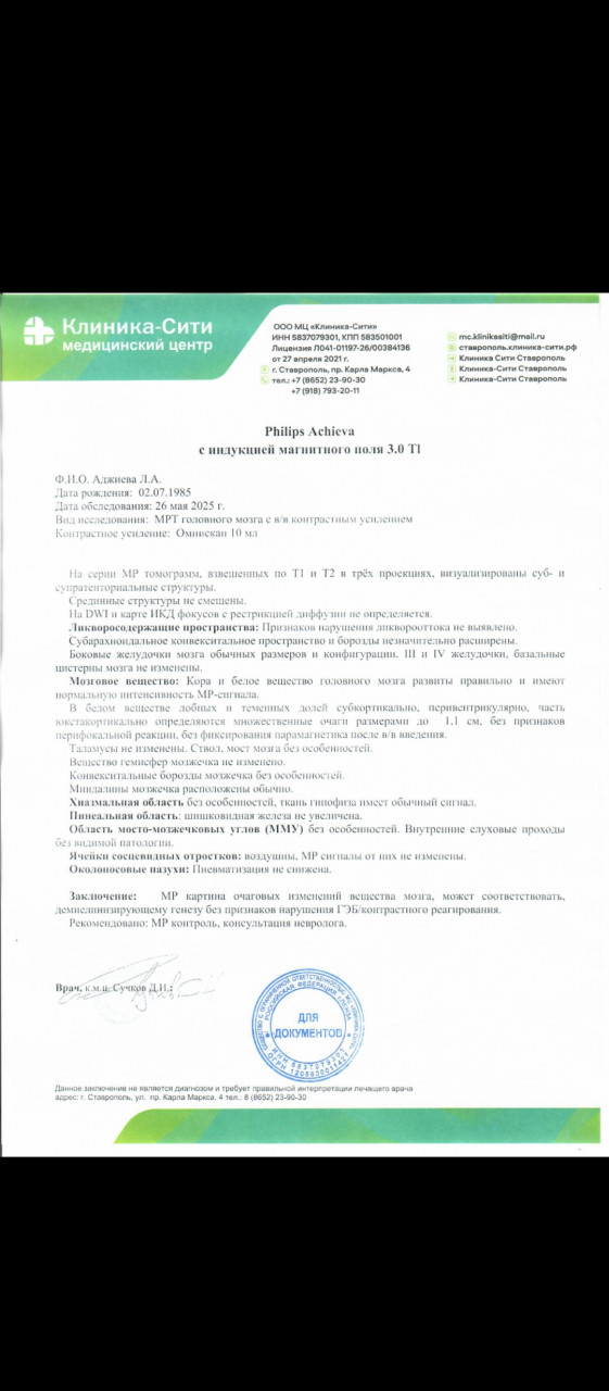 Здравствуйте. Последние два года беспокоят головные боли, головокружения. В последние два месяца добавились неприятные ощущения в области сердца (как будто оно опухло), горячо в этой области, тахикардия, проблемы с памятью, мышлением (забываю, что делала, не могу порой четко сформулировать мысль, нарушена мозговая деятельность), головные боли сопровождаются небольшим повышением температуры головы (где-то 37 градусов) . Головные боли в последний месяц сильные, при приступах лежу. Меня периодически кусали клещи. В 2000 году кусал энцефалитный клещ, после чего появились головные боли и практически постоянный слабый насморк. До последнего времени на это не обращала особого внимания, когда головная боль была сильной принимала Спазмалгон и Пенталгин. Три года работала с человеком, переболевшим менингитом. Меня царапали кошки, кусали блохи собак, регулярно пила некипяченное молоко (читала, что это может привести к заболеваниям нервной системы с головными болями). В 2010 году лежала в стационаре больницы, диагноз синдром Гиенна-Барре. В 2014 году появились слуховые и зрительные галлюцинации. В 2022 году проходила лечение в психиатрической больнице, диагноз параноидальная шизофрения. Делала дважды мрт мозга, результаты прилагаю. Два месяца назад занялась самолечением с помощью настойки гиностеммы, после двух стаканов которой резко усилились слуховые галлюцинации, произошли приступы тревожности, тахикардии, было ощущение, что вот-вот остановится сердце, был сильный озноб. У меня повышен норадреналин (712), уровень метанефрина и норметанефрина в пределах нормы. Анализ на клещевой энцефалит, менингит отрицательные. Пульсовое кровенаполнение сонных артерий значительно снижено, позвоночных артерий резко снижено. Гипотония венозной сети позвоночных артерий резко выражена слева, незначительная справа. Венозный отток сонных артерий значительно затруднен справа, резко затруднен слева. Подскажите, что со мной такое.