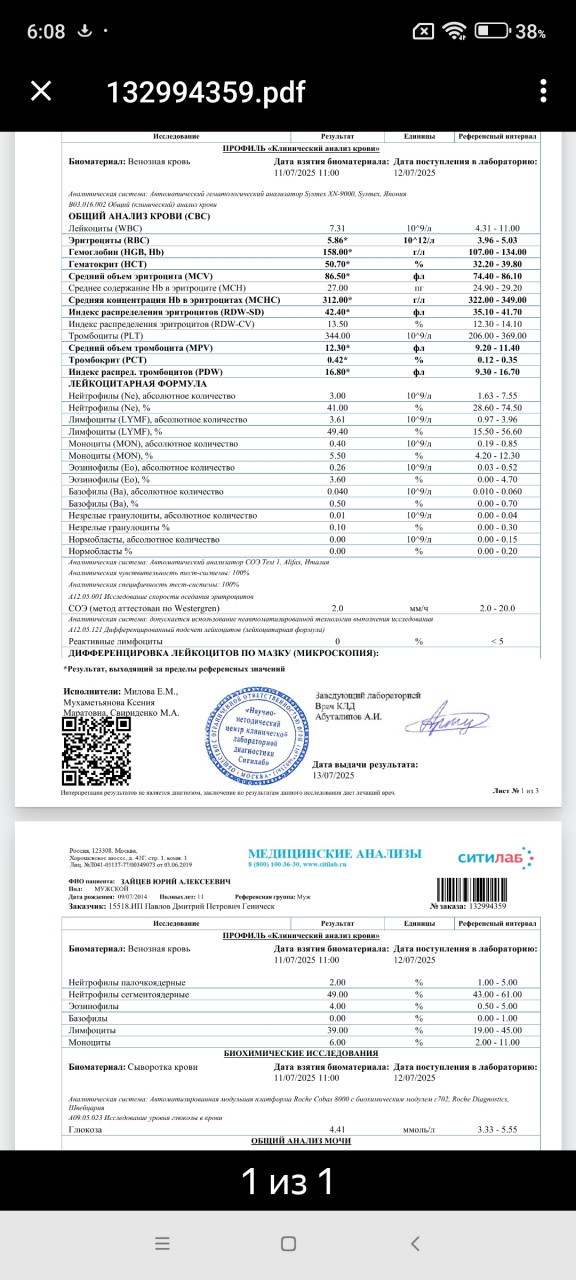 Здравствуйте. Моему сыну 11 лет. Активный, проблем с жкт нет, аппетит хороший, болеет редко( простудные заболевания). На данный никаких признаков какого либо заболевания нет, ничего не болит и не беспокоит.Сдали ОАК и ОАМ, т.к проходим медкомиссию перед. И результат напугал. Пожалуйста, расшифруйте