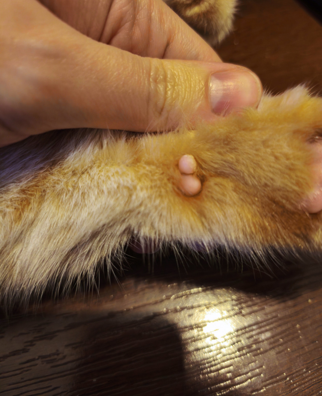 При осмотре на лапе, на которую она прихрамывала, обнаружила, что на запястной подушечке какой-то нарост. Раньше никогда не обращала на эти подушечки внимания, поэтому не могу сказать появился ли этот нарост недавно или уже давно.
