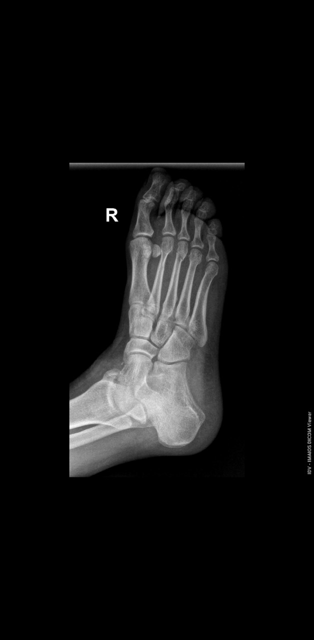 Здравствуйте. На представленных рентгенограммах виден перелом основания пятой плюсневой кости (возможно по типу перелома Джонса). Смещение минимальное, линии перелома ровные. Если нет значительного смещения и фрагменты стабильны тогда обычно достаточно иммобилизации (гипс или ортез) и покоя. Но окончательное решение о тактике лечения принимается очно с учётом симптомов, осмотра и контроля снимков в динамике.