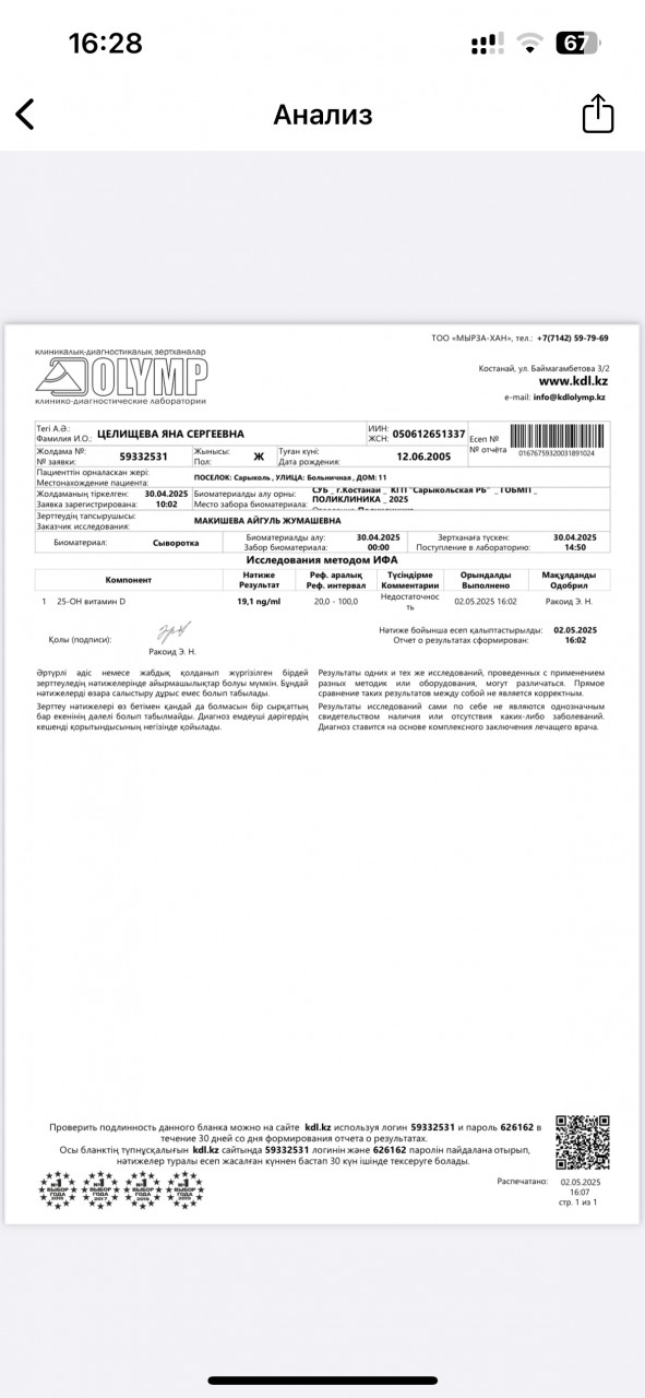 Здравствуйте. Прикрепленный анализ витамина D не относится к гинекологической диагностике и не объясняет проблемы с циклом. Если есть подозрение на миому, её наличие и размеры должны подтверждаться УЗИ органов малого таза. При длительной аменорее важно провести обследование у гинеколога-эндокринолога т.е сделать УЗИ, сдать гормоны (ФСГ, ЛГ, пролактин, ТТГ, эстрадиол), исключить синдром поликистозных яичников и другие эндокринные нарушения. Многие гормоны (ТТГ, пролактин, андрогены, АМГ) сдают независимо от наличия менструации. Если месячных нет, врач обычно назначает анализы в любой день цикла, чтобы оценить работу яичников, гипофиза и щитовидной железы. Это поможет понять причину аменореи и подобрать лечение.