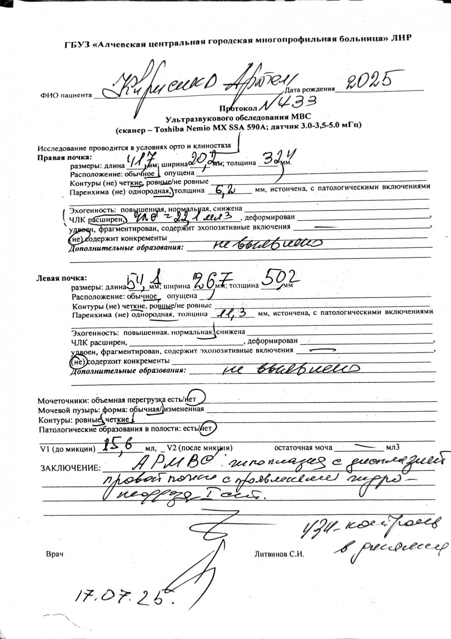После приехав через полтора месяца нам уже ставят диагноз дисплазия правой почки, Пилоэктазия 1ст правой почки.