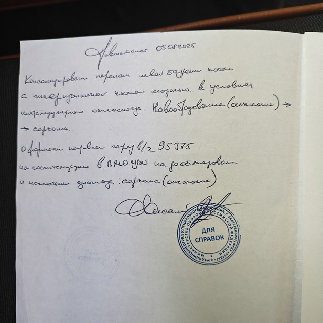 Здравствуйте. В заключении написано, что у пациента был перелом бедренной кости, который сросся с избыточным образованием костной ткани. Это может быть вариантом нормы, но также может напоминать опухоль. Поэтому врач указал "саркома?" с вопросом это не диагноз, а подозрение которое нужно исключить. На данный момент диагноз онкология не установлен, требуется госпитализация для уточнения. Дообследование нужно, чтобы исключить серьёзную патологию.