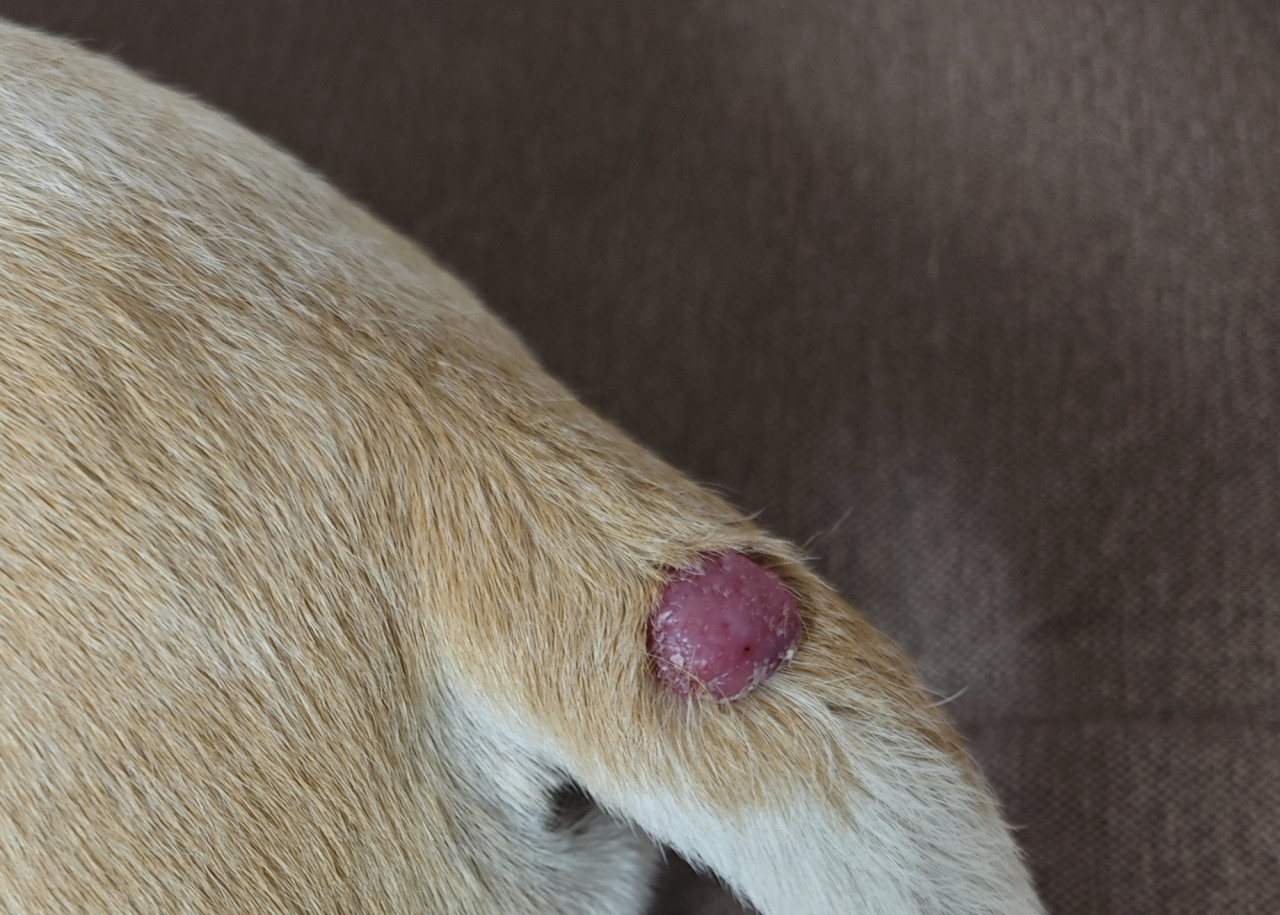 Здравствуйте. По фото это похоже на кожное новообразование это возможно опухоль сальных желез, папиллома, кожная гранулёма или другое образование. Точно определить его природу можно только после очного осмотра и цитологического или гистологического исследования. Рекомендую как можно скорее показать собаку ветеринару-хирургу или онкологу т.к такие образования могут травмироваться, кровоточить и в некоторых случаях быть злокачественными. Не пытайтесь самостоятельно обрабатывать или удалять, до визита следите, чтобы собака не разлизывала и не травмировала участок.