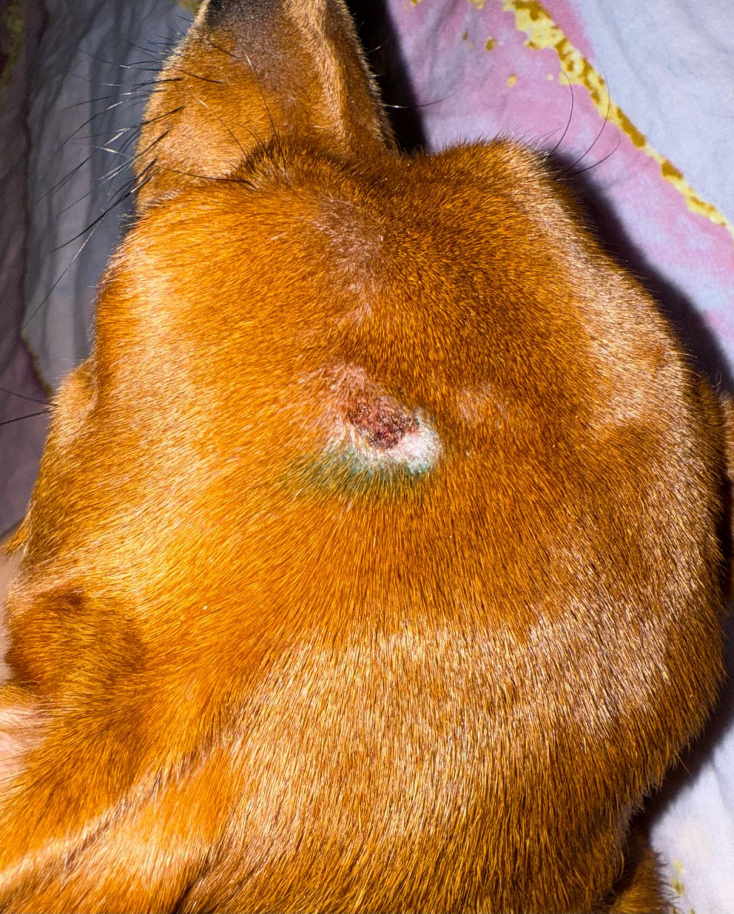 Около 1,5 недель назад появилась рана на голове, которая увеличивается в размерах и на ее месте не стало шерсти. Обрабатываем хлоргексидином, мазали зеленкой- ничего не помогло. Собака чешет и сдирает корочку. Да и в целом у собаки зуд по всему телу . Предпологаю что возможно это связано с обработкой от блох. Подскажите, как помочь собачке ?