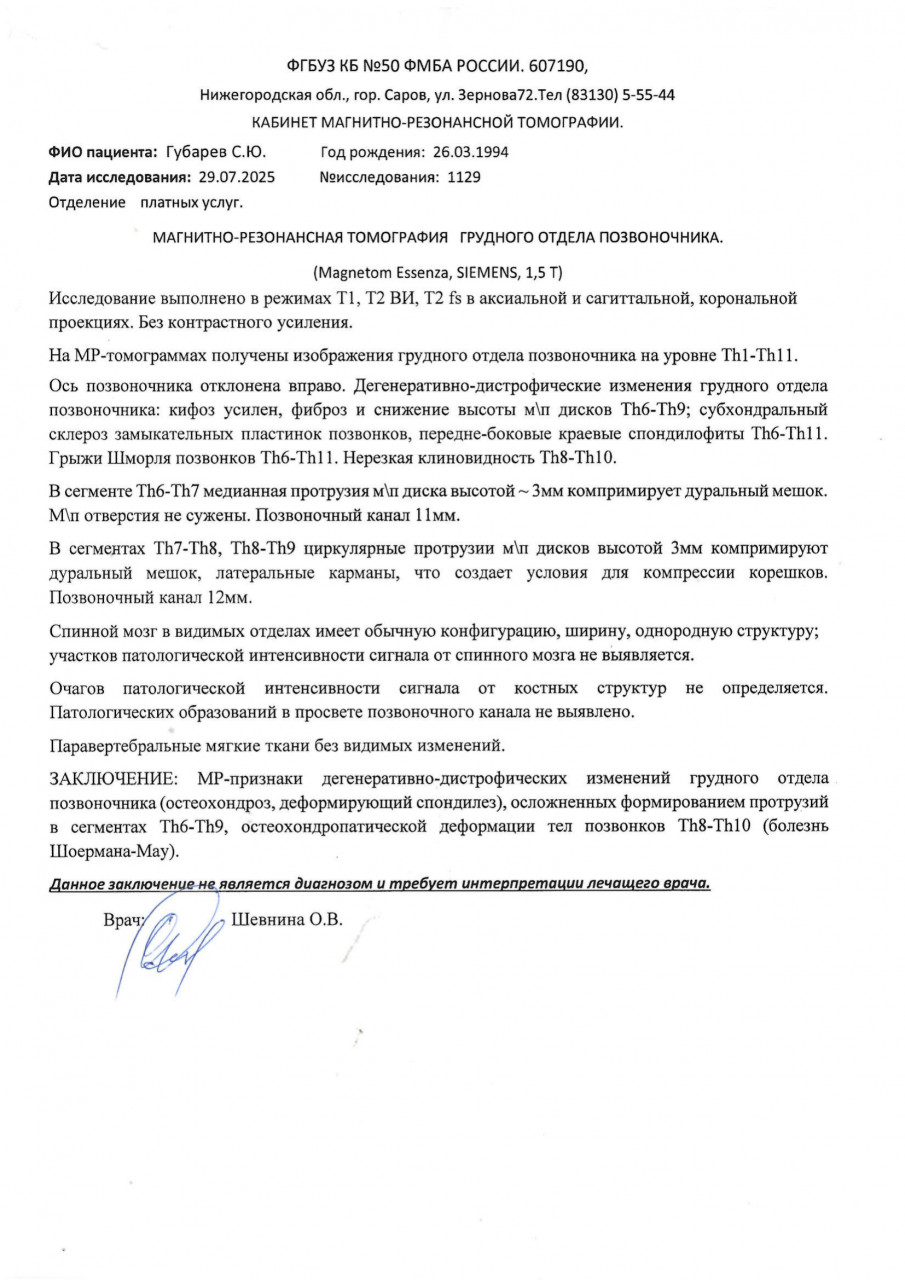Здравствуйте. По результатам МРТ у вас выявлены выраженные дегенеративные изменения грудного отдела позвоночника, протрузии дисков и признаки болезни Шойермана-Мау, что объясняет боли и эпизоды «заклинивания». Важно избегать длительного сидения, укреплять мышцы спины и пресса лечебной гимнастикой, регулярно выполнять упражнения на растяжку, плавание. При обострении применяют курсы НПВС, миорелаксантов, физиотерапию. Рекомендую обратиться к травматологу-ортопеду для подбора индивидуальной программы ЛФК и решения вопроса о ношении поддерживающего корсета в периоды нагрузки.