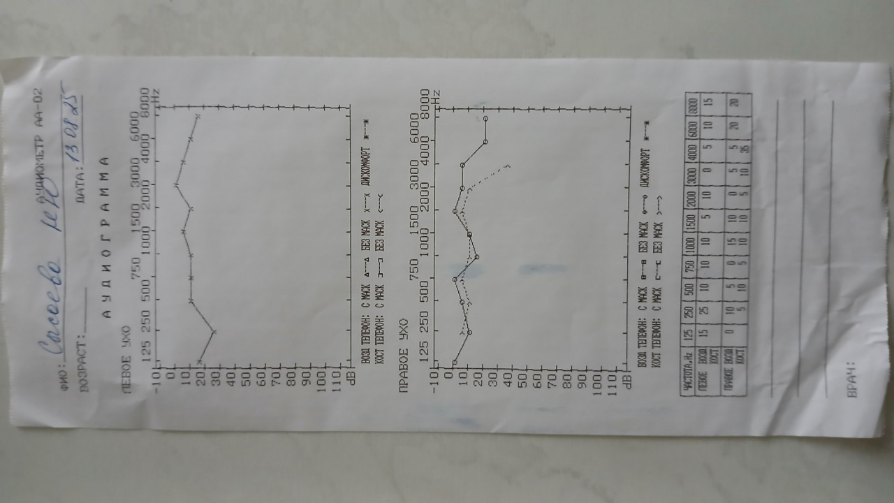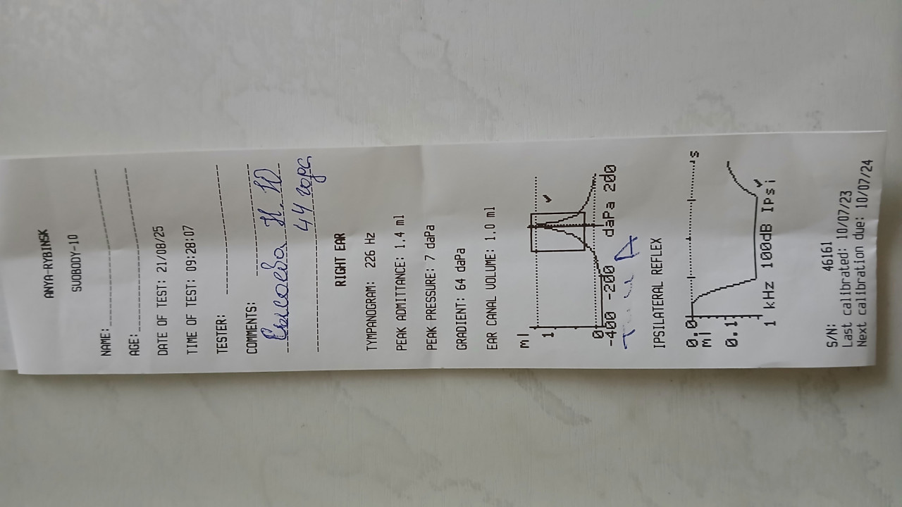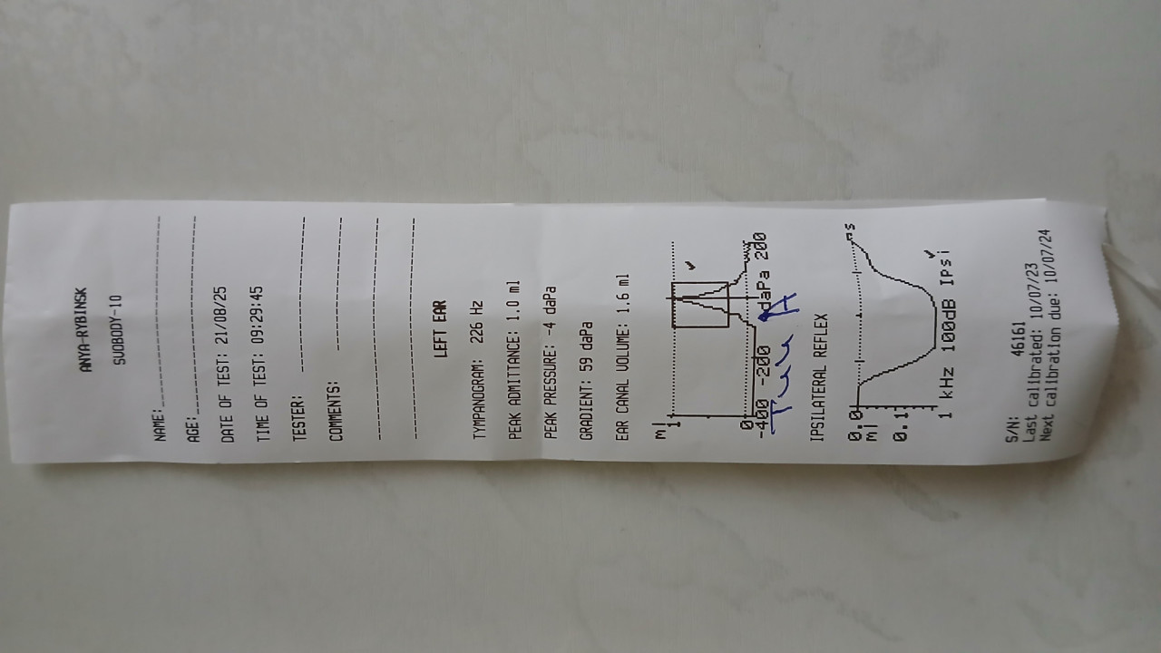 Здравствуйте. По результатам вашей аудиограммы слух в пределах нормы, признаков выраженной тугоухости нет. Тимпанометрия также в норме (тип А с обеих сторон), подвижность барабанных перепонок сохранена, давление в среднем ухе без отклонений. Это говорит о том, что на момент обследования признаков экссудативного отита или стойкой дисфункции слуховой трубы нет. Ваши жалобы на заложенность, щелчки и «хлюпанье» особенно при нагрузке чаще всего связаны с нарушением работы слуховой трубы (тубоотит, евстахиит). Такие проявления могут быть периодическими, усиливаться при изменениях давления, насморке или аллергии.