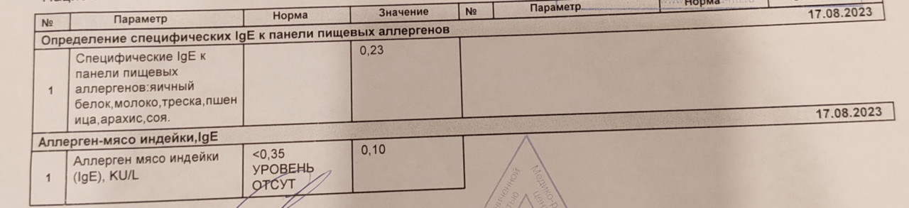 Ещё 2 года назад сдавали IgE панели пищевых аллергенов. Фото прикрепила. Скажите пожалуйста, что там написано, что можно есть, а что нет? Что-то не пойму в табличке где яичный белок, молоко, треска, пшеница, арахис, соя что там написано, что означает значение 0,23?