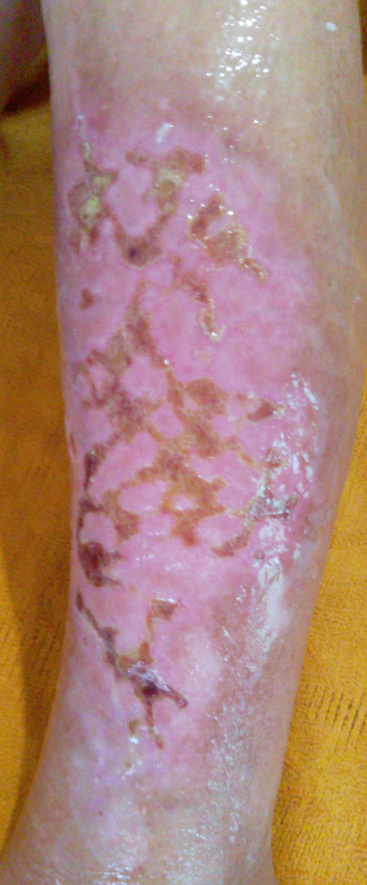 Здравствуйте. По фото видно ожоговую рану на этапе заживления, но сохраняются участки воспаления и налёты, что может указывать на присоединившуюся инфекцию. Боль тоже может быть признаком воспаления.