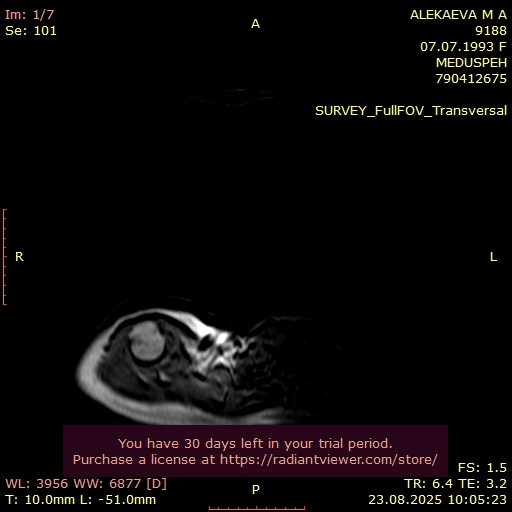 ПРОТОКОЛ МАГНИТНО-РЕЗОНАНСНОЙ ТОМОГРАФИИ Исследование выполнено в аксиальной, сагиттальной плоскостях, в T1W, T2W, PD, Головка правой плечевой кости имеет обычную конфигурацию и сочленяется с нормально развитой суставной ямкой. Суставные поверхности имеют относительно четко очерченные края. Суставная щель минимально сужена. Полость сустава содержит физиологическое скопление свободной жидкости. Определяются участки реконверсии костного мозга видимых костных структур. Акромиоклавикулярный сустав имеет обычную конфигурацию, отмечаются невыраженные дегенеративные изменения в виде неровностей контуров суставных поверхностей, краевых остеофитов; в полости сустава невыраженное скопление свободной жидкости; подакроминальные мягкие ткани имеют местами повышенный МР-сигнал, нельзя исключить проявления импиджмент синдрома, соотнести с клинико-анамнестическими данными. Сухожилие надостной мышцы типично расположено, определяется его невыраженное разволокнение, МР-сигнал местами повышен, целостность достоверно не нарушена. Сухожилие подостной мышцы типично расположено, убедительно не изменено. Сухожилие малой круглой мышцы, суставно-плечевые связки – без признаков повреждения. Сухожилие двуглавой мышцы определяется в типичном месте (в межбугорковой борозде), не изменено. По ходу сухожилия физиологическое скопление свободной жидкости. Сухожилие подлопаточной мышцы типично расположено, без убедительных признаков повреждения. Остальные мышцы, покрывающие плечевой сустав, имеют неизмененную интенсивность сигнала. Губа суставной впадины плечевого сустава невыраженно дегенеративно изменена, без убедительных МР-признаков повреждения. Заключение: МР-признаки начальных проявлений остеоартроза правого плечевого и акромиоклавикулярного сустава (1 ст), нельзя исключить проявления импиджмент синдрома (соотнести с клинико-анамнестическими данными). МР-картина невыраженных проявлений тендинопатии сухожилия надостной мышцы. Невыраженный синовит акромиоклавикулярного сустава. Рекомендовано: Консультация травматолога-ортопеда. При необходимости КТ для оценки костных структур / УЗИ.