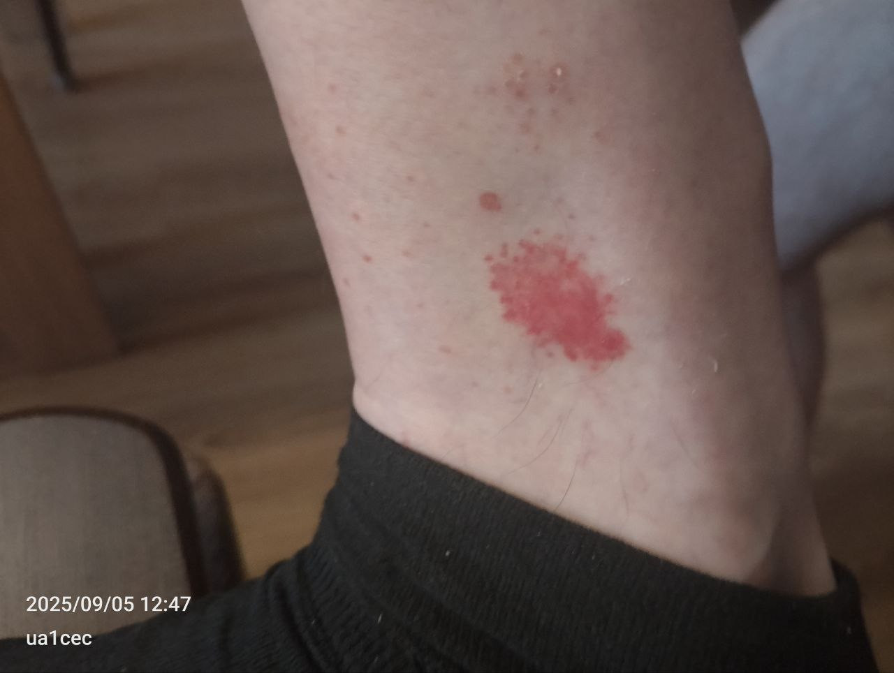 Добрый день. Появилось пятно на ноге, сначала было розовое и меньшего размера и чуть шелушилось. Потом увеличилось покраснело и перестало шелушиться. Не чешется, не болит.  Сопутствующие заболевания - варикоз и часто сводит ноги
