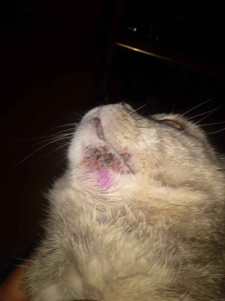 - если кот чешет подбородок, появляются язвы, кровь