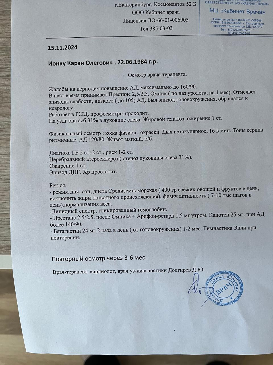 Здравствуйте, год назад резко подскочило давление до 160/90. поставили диагноз ГБ 2ст, назначили препарат Престанс 5/5 стал пить, стало падать давление ниже 120/80 ( падало до 105 плохо чувствовал себя). Рекомендовали снизить дозу путём половины таблетки. Отказался полностью от него, сбросил вес на 9 кг ( был 94, сейчас 85, путем пеших прогулок 5-7 км (бег 2-3ккм) через день или каждый день) давление больше 130/100 не подымается но на изменение погоды становится плохо голова как в тумане и кружится. Решил пробывать снова принимать Престанс с малой дозой давление 117/84, чувствую себя не плохо, но при прогулке сегодня в парк опять стало плохо как помутнение! По анализам все в порядке, узи сердце тоже все хорошо , также делал узи шеи где показало уздг асб 31 процент. Помогите выйти из этого состояния, что делать?