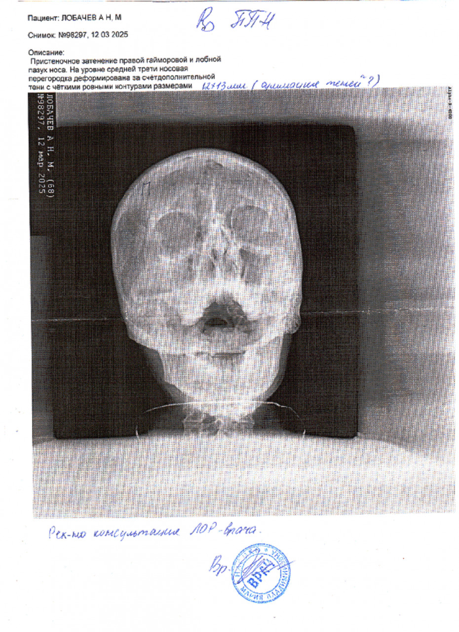 Здравствуйте. На рентгене описаны пристеночные затемнения пазух, что чаще всего связано с хроническим воспалением слизистой. Дополнительная тень с ровными контурами в области перегородки может быть вариантом анатомической особенности (например костный выступ, утолщение, синехия) либо наложение проекций разных структур и именно это и называется «суммацией теней». То есть рентгеновские тени нескольких костей или тканей накладываются друг на друга и создают впечатление отдельного образования. Чтобы исключить объёмное образование, более информативным методом остаётся КТ пазух, но исходя из описания речь скорее идёт об анатомической деформации и хроническом рините, а не об опухолевом процессе.