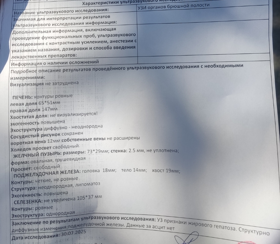 Здравствуйте. По результатам анализов и УЗИ у вас жировой гепатоз и изменения поджелудочной железы, что объясняет тяжесть и дискомфорт справа. Рекомендую диету с ограничением жирного, алкоголя и сладкого, контроль сахара и билирубина, а также очную консультацию гастроэнтеролога для подбора терапии.