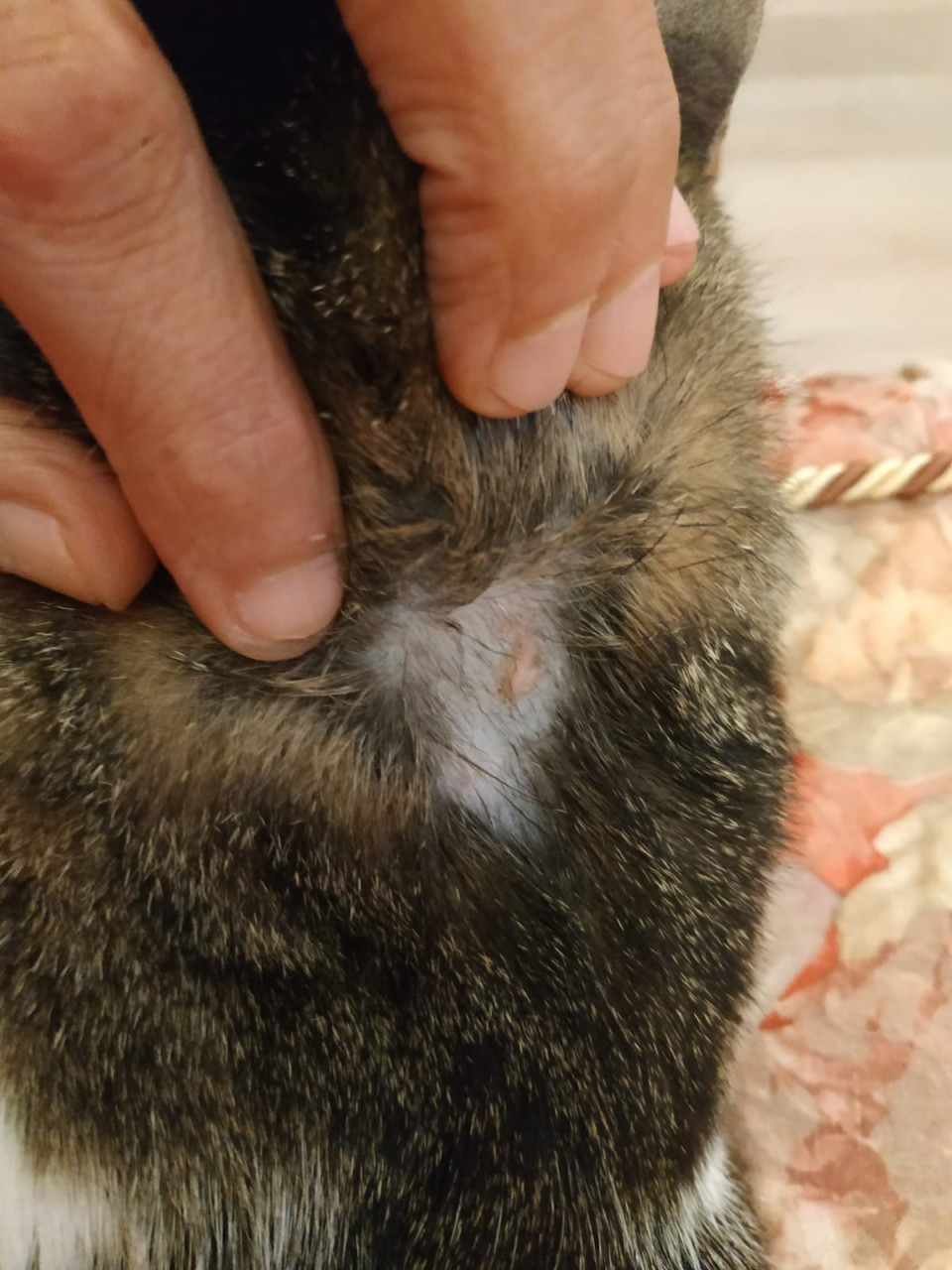 Здравствуйте. По фото залысина с корочкой может быть связана с дерматитом, грибковой инфекцией или аллергической реакцией. Можно аккуратно обработать место антисептиком (хлоргексидин) и попробовать противозудовые или противогрибковые местные средства для животных (спреи или мази с миконазолом, клотримазолом). Иногда помогают специальные ветеринарные шампуни от дерматита. Но если очаги будут увеличиваться, появятся новые залысины или кошка начнёт сильно чесаться тогда обязательно нужно показать животное ветеринару для обследования, соскоба и точного лечения.