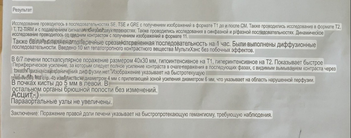 Заключение: Поражение правой доли печени указывает на быстротекущую гемангиому, требующую наблюдения..
