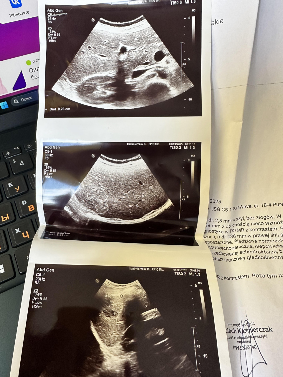 Печень была нормоэхогенной, не увеличенной, субкапсулярно в VI сегменте было видно четко очерченное, вероятнее всего инкапсулированное поражение со смешанной эхогенностью.
