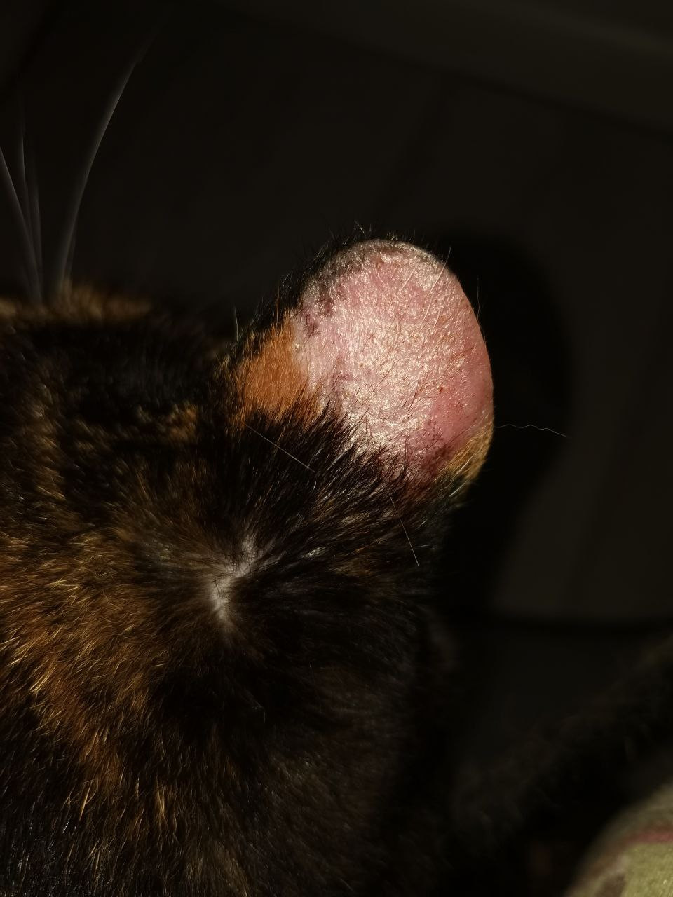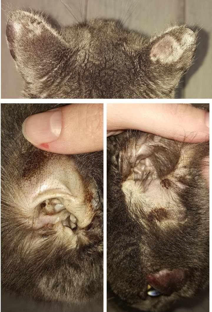 Обе кошки все это время ходили в воротниках, сегодня я решила их снять. Они начали умываться. Итог - первая кошка (с бОльшим поражением) опять себя растерла, шерсть выпала клочками; под глазом аж до крови растерла, уши выглядят нездоровыми (что-то коричневое). У второй кошки шерсть клочками не выпадает, только отдельными шерстинками.