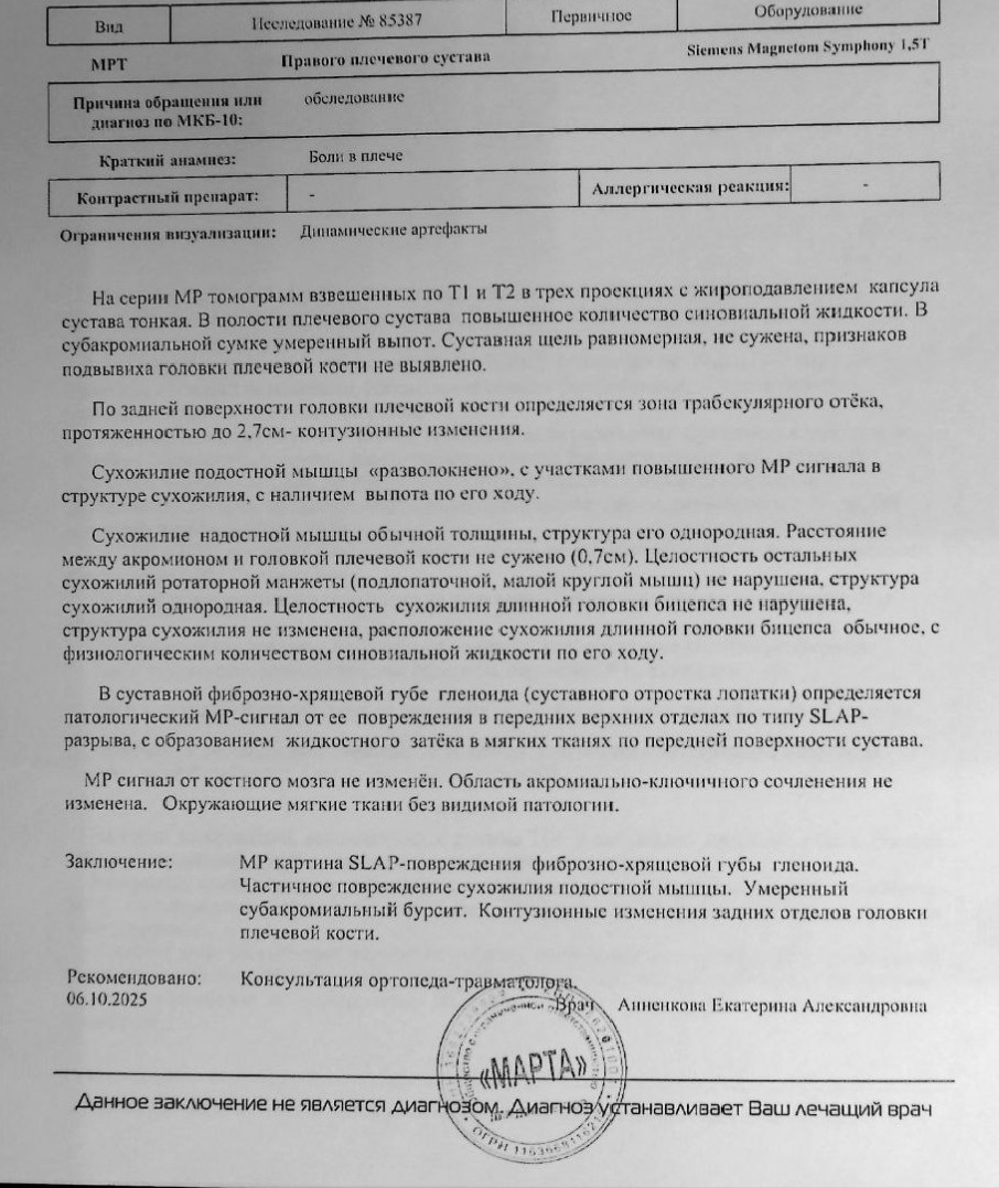 Здравствуйте. По результатам МРТ у вас зафиксировано SLAP-повреждение суставной губы, частичное повреждение сухожилия подостной мышцы, бурсит и костной контузии это типичные последствия травматического вывиха плеча. Рекомендую очную консультацию травматолога-ортопеда для оценки степени повреждения губы и сухожилий. В большинстве случаев вначале проводят консервативное лечение т.е иммобилизацию руки на короткий срок, противовоспалительные препараты, физиотерапию и курс реабилитационных упражнений для восстановления стабильности сустава. Если сустав станет нестабильным или боли сохраняются, может потребоваться артроскопическое вмешательство. Не затягивайте с визитом к врачу, чтобы избежать повторных вывихов.