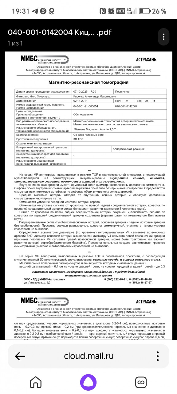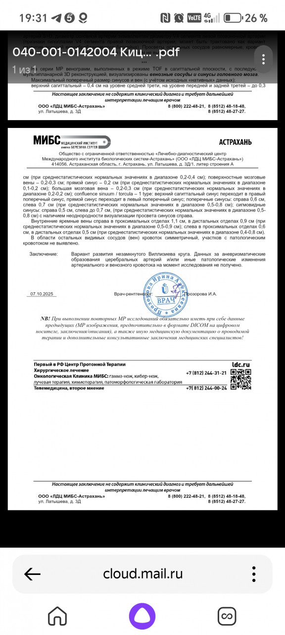 Здравствуйте. По описанию МРТ сосудов головного мозга патологических изменений не выявлено, только вариант развития сосудистой системы (незамкнутый Виллизиев круг, гипоплазия правой позвоночной артерии) это индивидуальная анатомическая особенность, не болезнь. Так как головные боли сохраняются годами и не связаны с сосудистой патологией, нужно уточнить:
