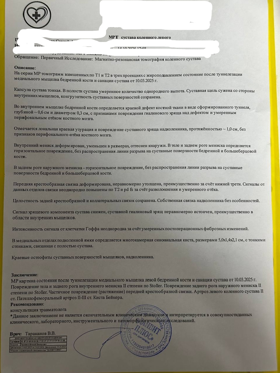 После снижения боли лечебная гимнастика (упражнения без осевой нагрузки, укрепление мышц бедра). При сохранении блокад и болей - консультация ортопеда для решения вопроса об артроскопии.
