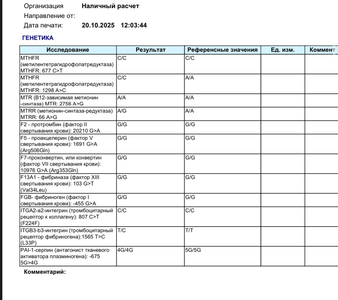 Здравствуйте, очень нужна ваша консультация. Планирую беременность, сдала генетическую панель, в связи с дефицитом фолиевой кислоты уровень был 2.3. Когда стала ее пить аж волосы расти начали там, где залысины были, видимо постоянно был такой дефицит. У мамы была тяжелая преэклампсия, когда она была беременна мной под наблюдением она была 2 месяца, давление не сбивалось, был белок в моче, кесарево сделали, когда в палате с ней у женщины умер ребенок и у меня была тяжелая гипоксия, больше беременностей у нее не было. Я сдала генетическую панель на мутации фолатного цикла и заодно на невынашивание беременности из-за маминого риска, подскажите, что делать с таким результатом и отягощенной наследственностью? На УЗИ вен нижних конечностей были уз признаки варикозного расширения, делала потому что у папы варикоз, давно уже.