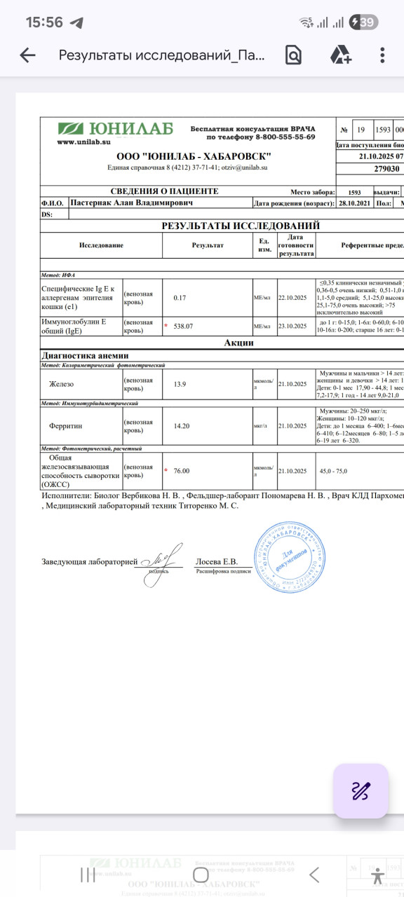 Показатель 538 МЕ/мл значительно выше нормы и говорит о выраженной аллергической предрасположенности или наличии хронического аллергического воспаления (например аллергический ринит, бронхиальная гиперреактивность, пищевая аллергия, атопический дерматит). Такой результат требует консультации аллерголога и он подберёт обследование на конкретные аллергены и даст рекомендации по лечению и профилактике обострений. Также рекомендую обсудить с педиатром необходимость коррекции питания и назначения препаратов железа. При низком ферритине важно восполнить запасы, чтобы не развилась анемия.