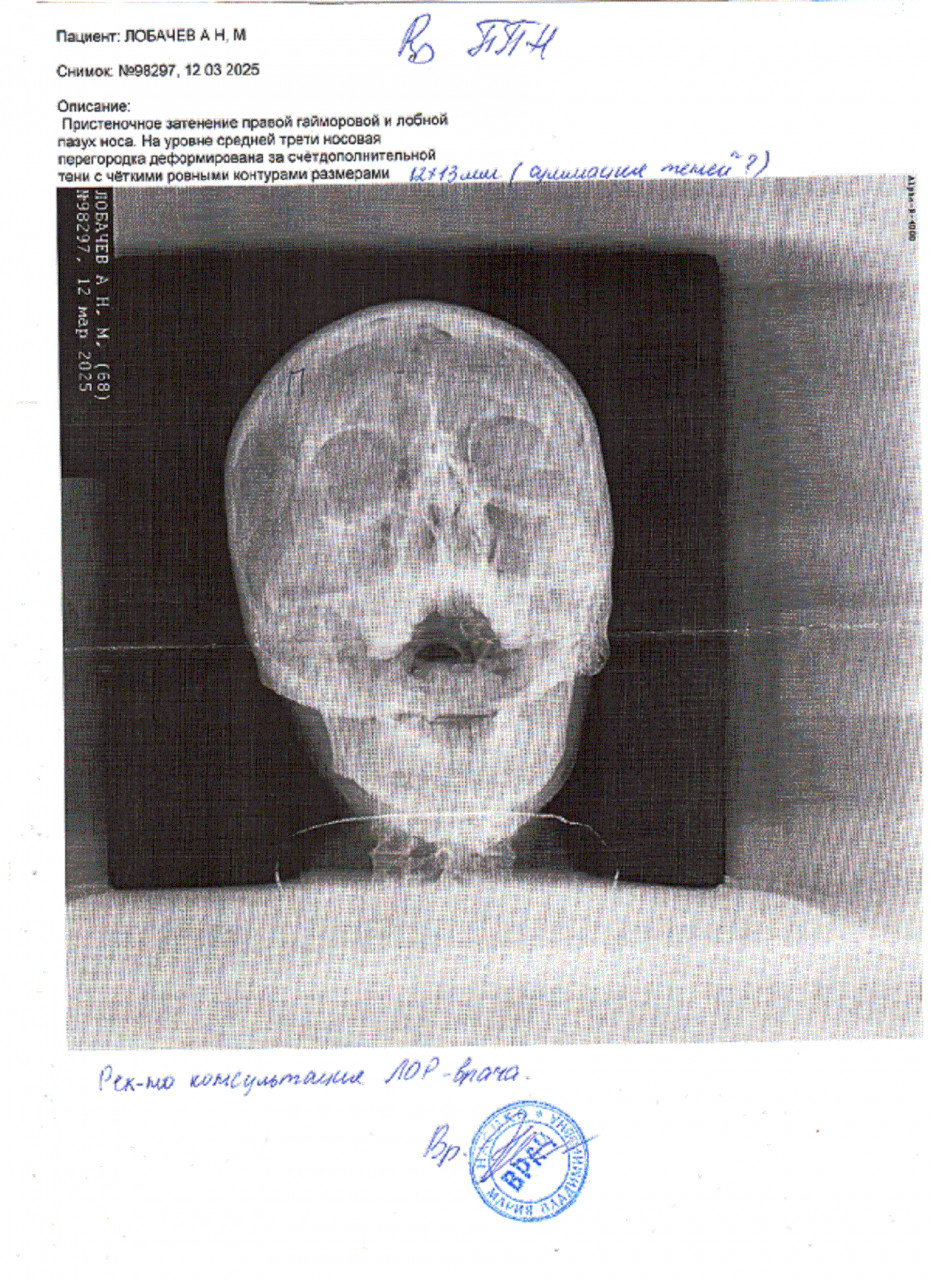 Здравствуйте. В 1984 года у меня была травма. Диагноз был такой: ушиб лицевого черепа, перелом костей носа в в/3 и н/3. После лечения осталось искривление носовой перегородки 2-3 ст. Позже появился хр. гипертрофический ринит. И еще в левой ноздре со временем появился какой-то "нарост" что ли. Можно прощупать пальцем как твердый бугорок. Этот бугорок почти полностью перекрыл левую ноздрю. Я все время считал, что это какой-то хрящ. В размере он больше не менялся. Но недавно делал рентген для МСЭ (сейчас в ДНР обязали всех, имевших производственные травмы, обязали пройти МСЭ). Рентгенолог сказал мне, что этот "бугорок" кость, а не хрящ, т.к. рентген хрящи не видит. Хотел получить Ваше мнение. ЛОРа у нас нет. Есть рентгеновский снимок, где это "бугорок" хорошо виден. И есть рапечатка на листе с цифрового рентгена. Отсканировать можно только лист. Качество получается не очень. Я прикреплю. Если я правильно понял, рисунок увеличивается на сайте. Посмотрите, пожалуйста, левая ноздря, где-то посередине носа. Если это кость, то как она разрослась в нос. Возможно был какой накол или перелом? Болело долго и долго беспокоил тройничный нерв. После ЛОРа лечился на неврологическом отделении. Спасибо.