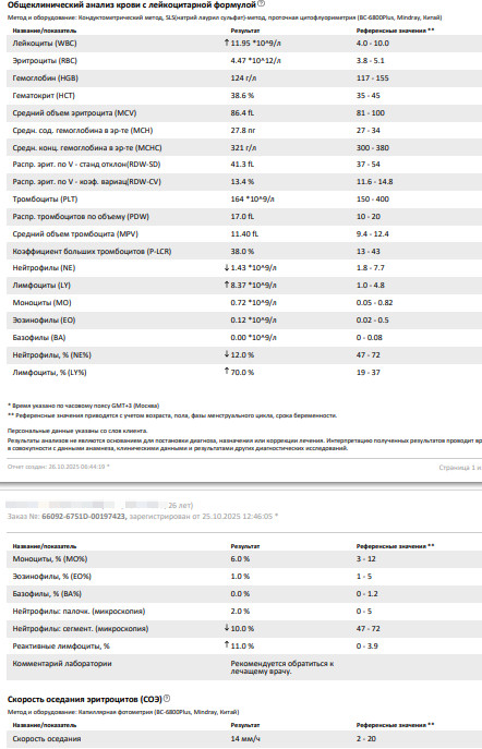 Здравствуйте. Судя по анализу у вас выраженный относительный лимфоцитоз скорее всего реактивного характера после вирусной инфекции это действительно частое явление и может сохраняться несколько недель. Однако чтобы исключить другие причины (вирус Эпштейна–Барр, цитомегаловирус, мононуклеозоподобные состояния, проблемы с кроветворением), нужно дообследование.