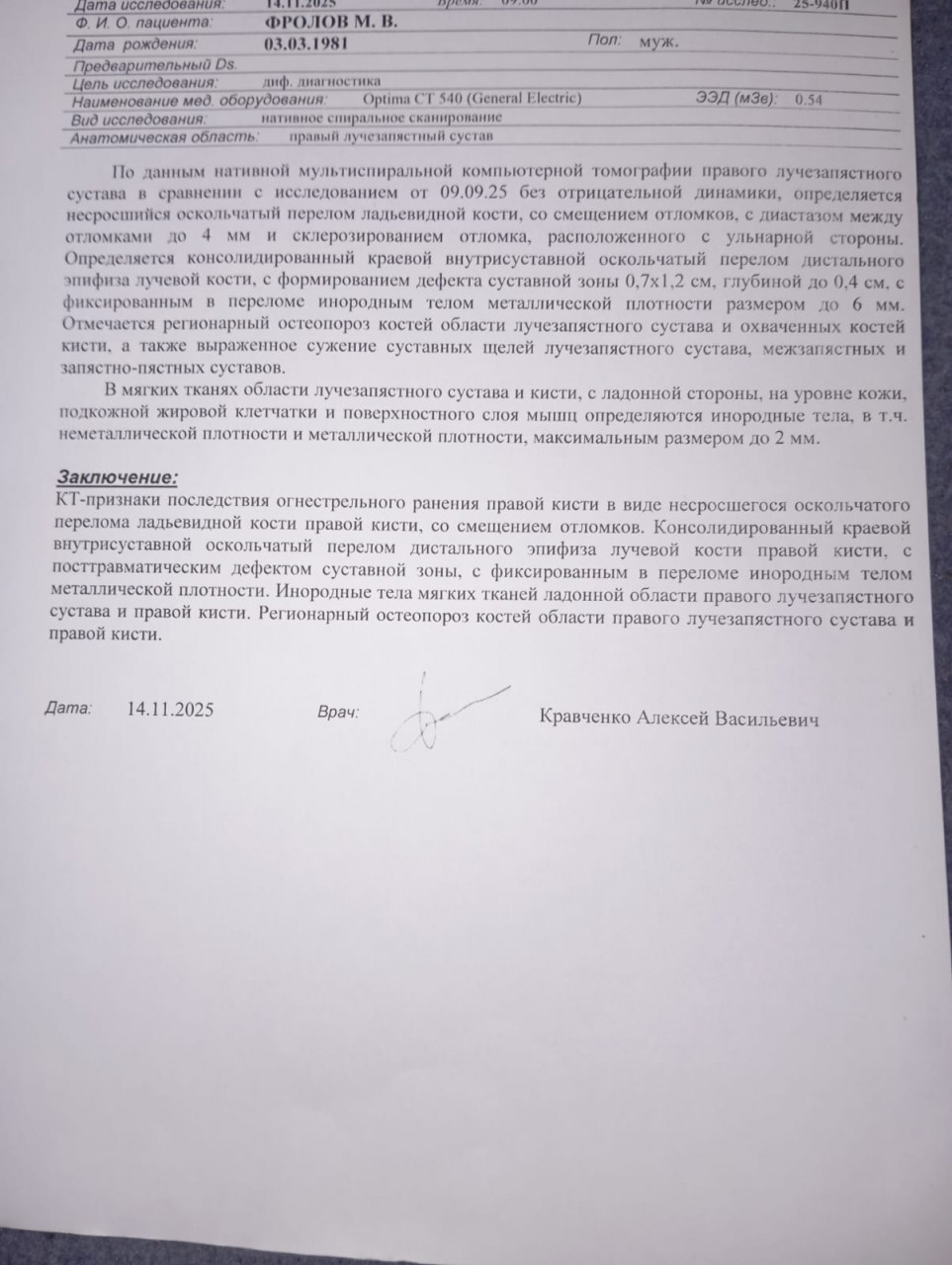 Здравствуйте. При таком длительном нарушении функции и данных КТ консервативное лечение уже неэффективно. Несросшийся перелом ладьевидной кости, наличие металлических и неметаллических осколков, а также признаки остеопороза и повреждение нерва требуют оперативного вмешательства. Обычно проводят ревизию раны, удаление инородных тел, остеосинтез или костную пластику, при необходимости  восстановление нерва. После этого назначают физиотерапию, реабилитацию и контрольное обследование. Без операции функция кисти скорее всего не восстановится.