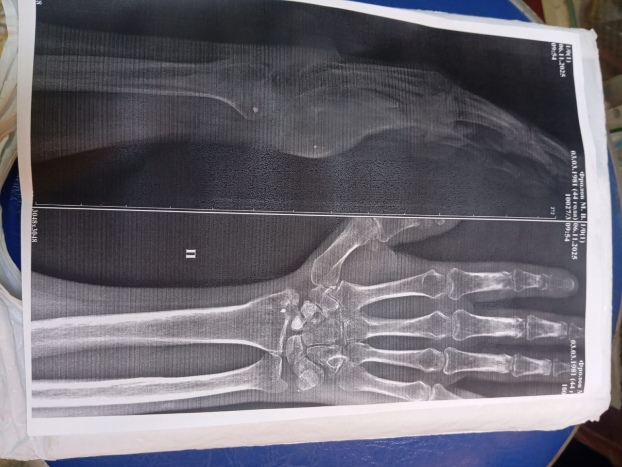 Здравствуйте. По снимку и описанию виден несросшийся перелом ладьевидной кости с выраженными посттравматическими изменениями и признаками остеопороза, а также повреждение срединного нерва. После шести месяцев без движения и при таких осложнениях одного гипса недостаточно и требуется хирургическое лечение. Обычно выполняют фиксацию ладьевидной кости с костной пластикой, удаление инородных тел, восстановление нерва и последующую иммобилизацию. После операции назначается физиотерапия, ЛФК и реабилитация под контролем травматолога и невролога.
