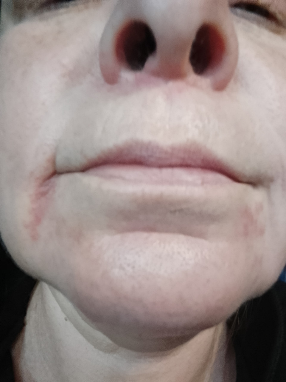 Высыпание в области носа и подбородка.